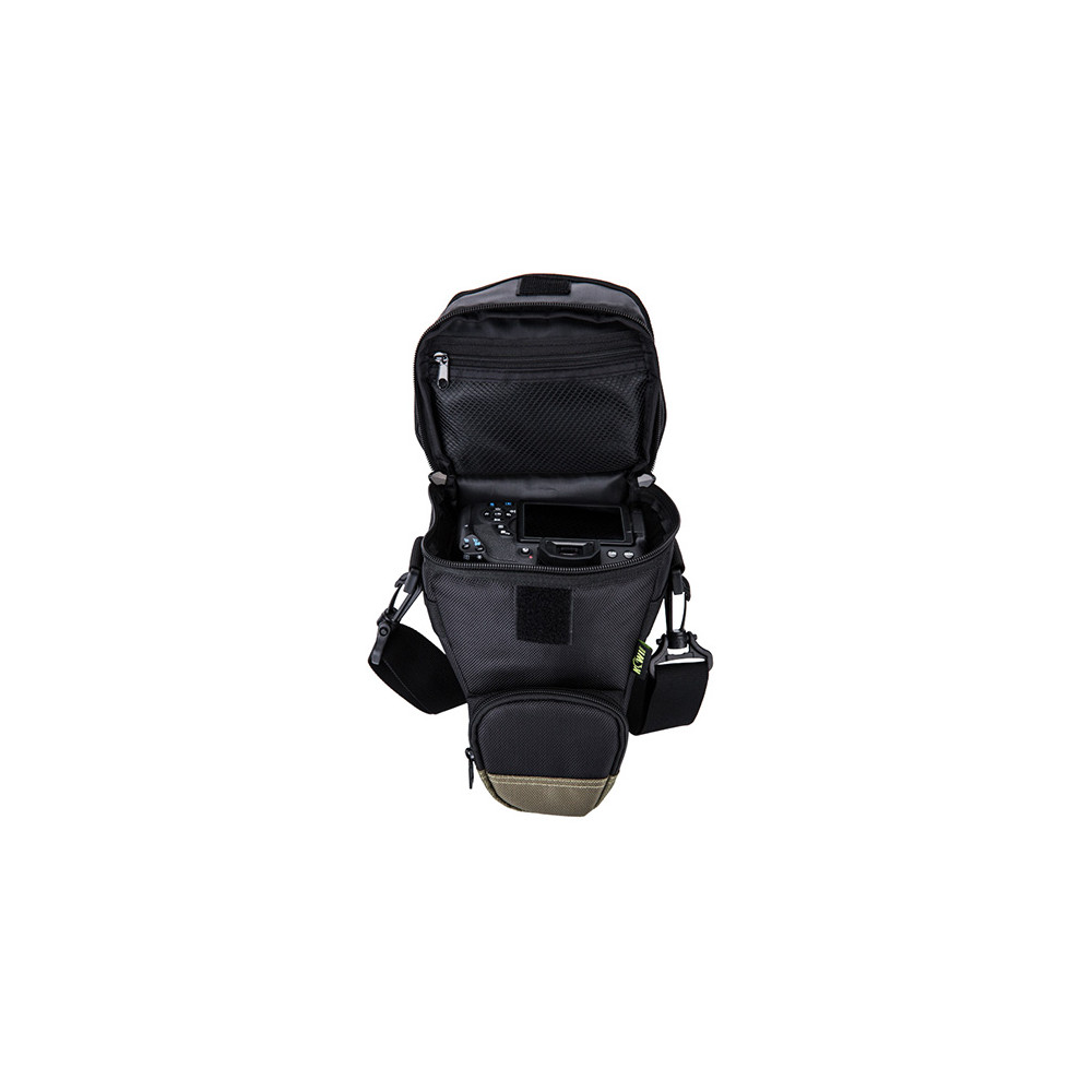 Brašna na fotoaparát KIWIFOTOS OC-10, vyrobená z polyesterové tkaniny odolné proti povětrnostním vlivům, slouží k uložení a ochraně fotoaparátu před prachem, vlhkostí, poškrábáním a nárazy. Brašna na fotoaparát je lehká a odolná. Vnitřní a přední kapsy na zip pro příslušenství umožňují uložit příslušenství fotoaparátu. Brašna na fotoaparát využívá dotykové zapínání a zapínání na zip k zabezpečení fotoaparátu a příslušenství. Brašna na fotoaparát je vybavena měkkým vnitřním polstrováním a účinně chrání fotoaparát a příslušenství před náhodnými nárazy. Pohyblivá přepážka s dotykovým zapínáním je určena ke konfiguraci vnitřního prostoru, když potřebujete. Brašna na fotoaparát nabízí tři možnosti nošení, které si můžete vybrat: nastavitelný odnímatelný ramenní popruh, nastavitelný pásek a polyesterové poutko pro nošení v ruce.