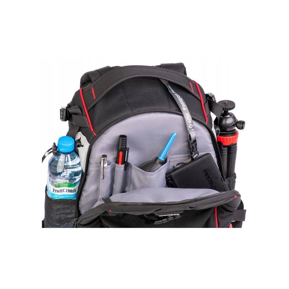Na bocích jsou dvě síťované kapsy na láhev s vodou nebo stativ. Nad každou kapsou jsou popruhy pro upevnění a zajištění stativu.
