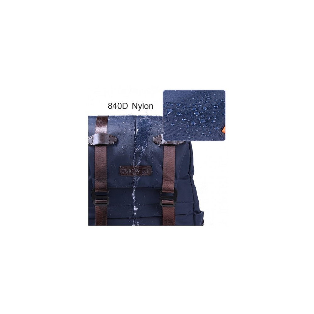 Batoh je vyroben z odolného, voděodolného nylonu 840D a jeho dno má dodatečnou výztuhu z eko kůže pro ochranu před vlhkostí nebo nečistotami. Přístup do horní přihrádky, uzavírané zipem, je zajištěn širokou klopou se dvěma popruhy, která nejen chrání před krádeží, ale také dodává batohu módní, ležérní vzhled. Jeho záda a nastavitelná ramena jsou navíc polstrovány měkkým, prodyšným materiálem, takže ani delší cesty s těžším nákladem nejsou zatěžující. Uživatel má dále k dispozici pomocný popruh s přezkou, vedený na úrovni hrudníku, a madlo. Batoh je dodáván s pláštěnkou, která jej účinně chrání před nepříznivými povětrnostními podmínkami.