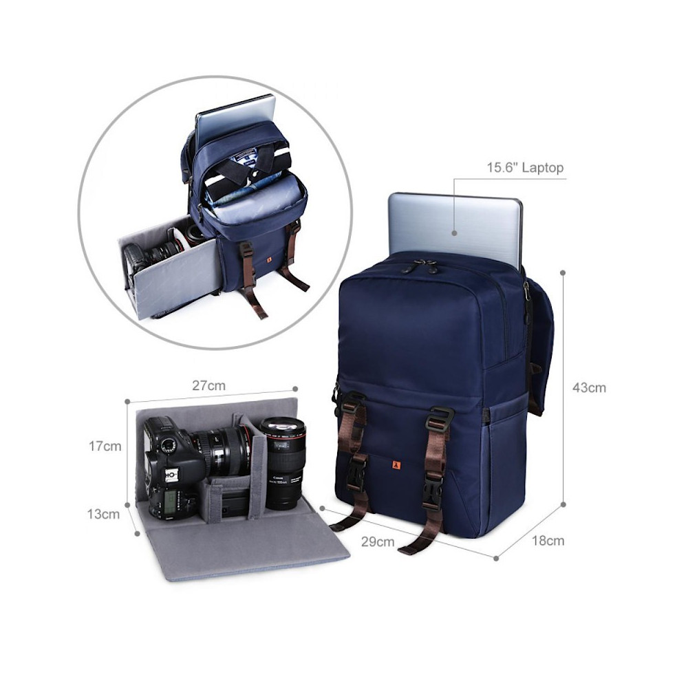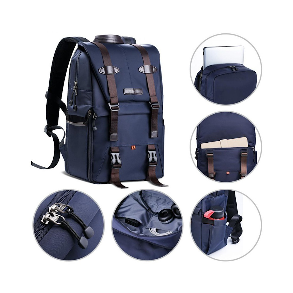 Funkční, prostorný, dvoukomorový městský fotobatoh K&F Concept. Určeno pro přepravu dronu nebo kamery s jedním nebo dvěma objektivy. Má také kapsu na notebook s maximální úhlopříčkou 15,6 palce a popruhy pro připevnění stativu. Včetně pláštěnky. Tmavě modrá barva.