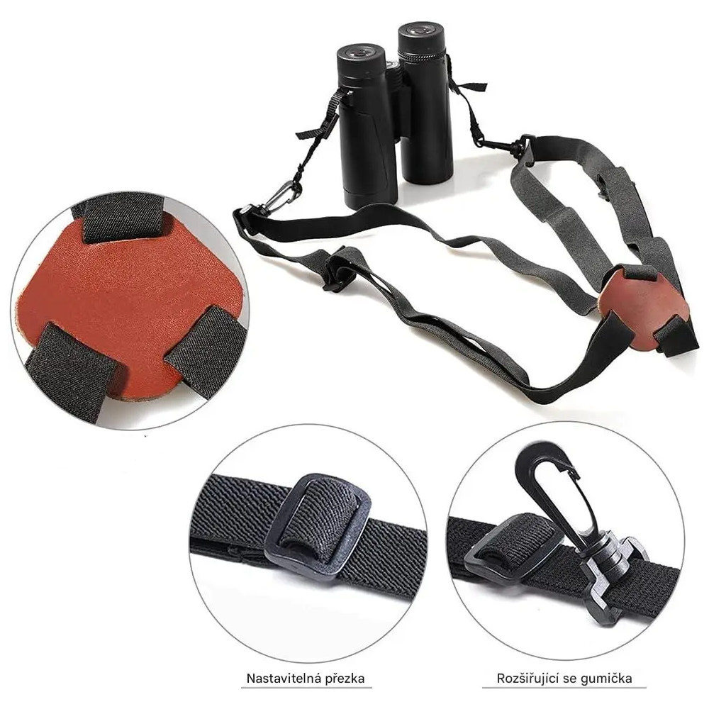 Materiál a konstrukce: Popruh je vyroben z pevného nylonového pásku, který je doplněn umělou kůží, což zajišťuje jeho dlouhou životnost a odolnost vůči opotřebení. Díky dvěma knoflíkovým dírkam na obou koncích je kompatibilní s dalekohledy většiny značek, což z něj činí univerzální volbu pro každého uživatele.