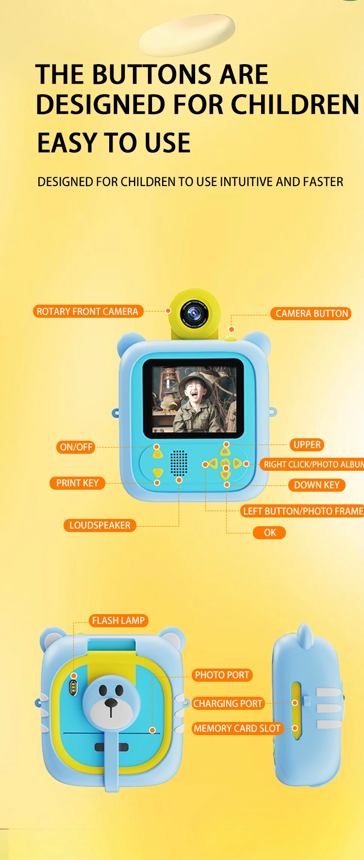 Dětský fotoaparát s okamžitým tiskem, motiv roztomilý medvěd žlutá barva, baterie o kapacitě...
