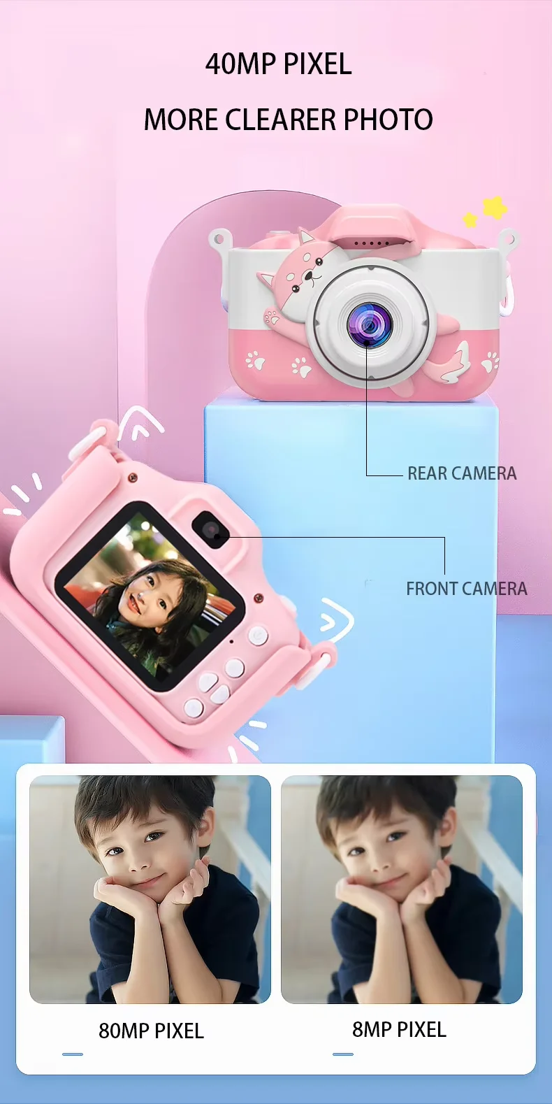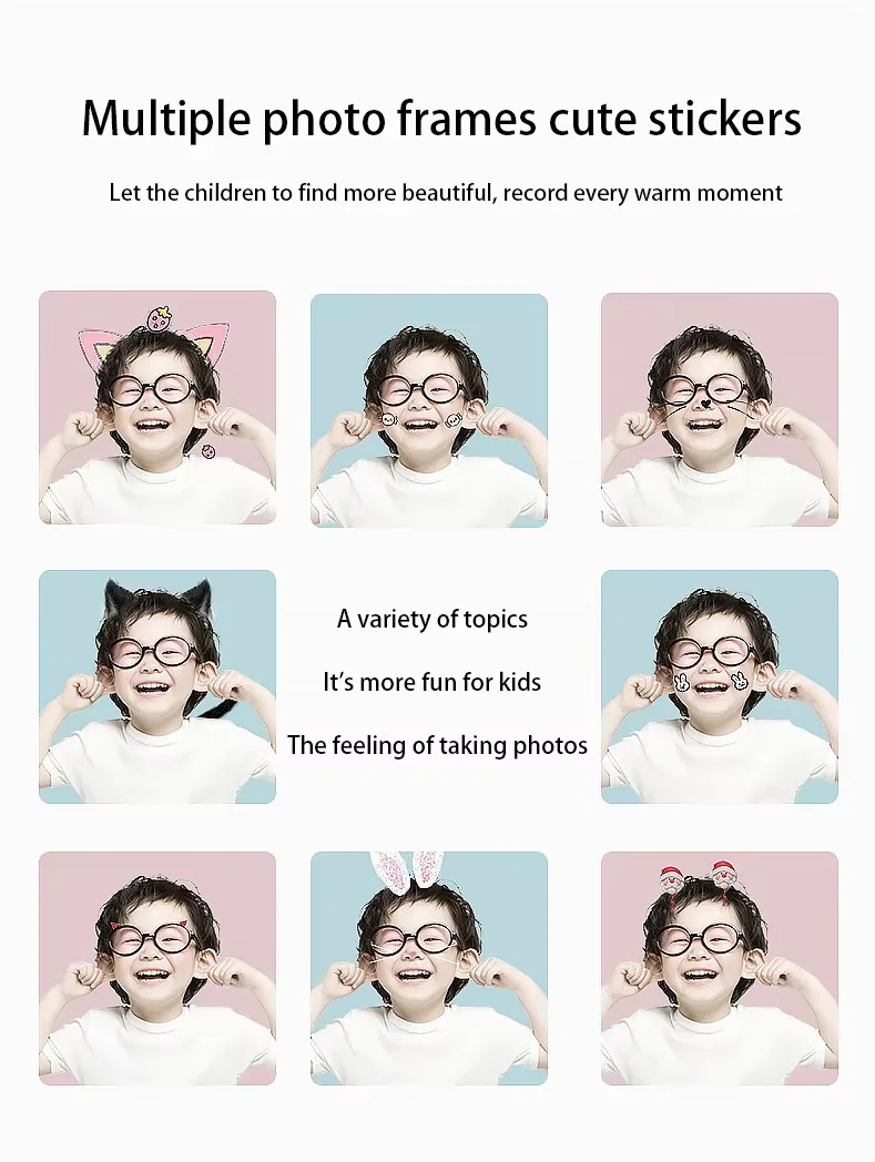 Funkce nahrávání, dualní objektiv, fotografie jedním kliknutím, nahrávání jedním kliknutím, hry, hudba, filtry. Velmi jednoduché ovládání . Vhodné pro děti od 3let.