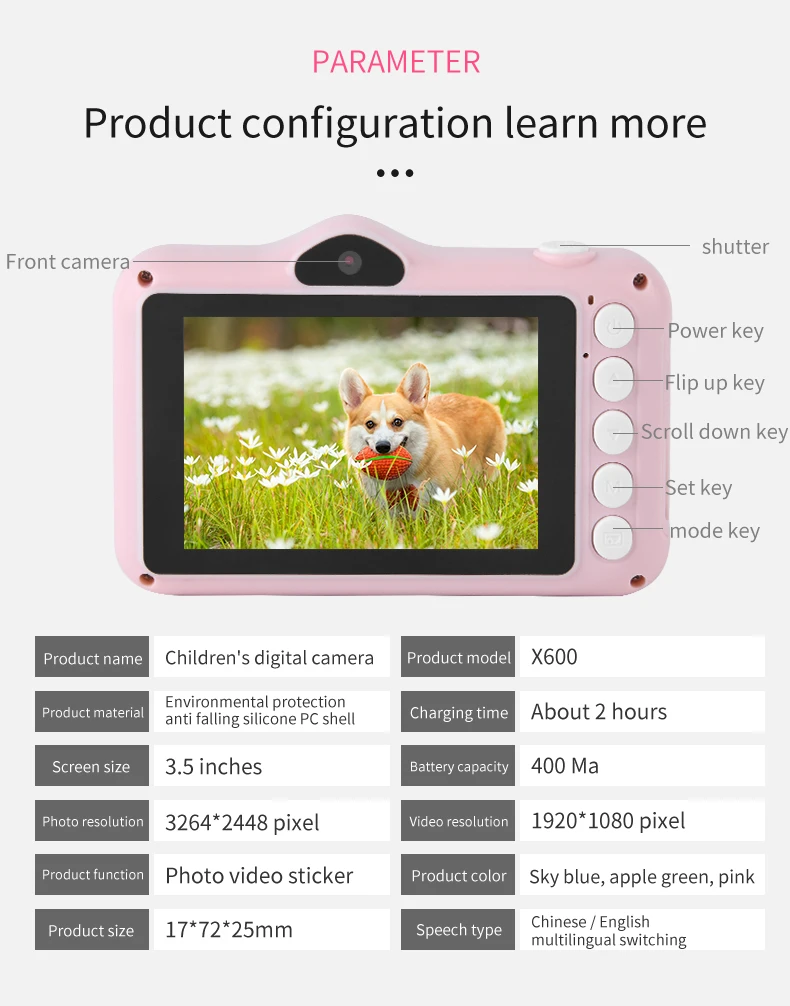 Digitální mini fotoaparát pro děti od 6 let. S obrazovkou 3,5palců. Rozlišení fotografie až 20M, HD obrazovka, Videokamera s rozlišením videa 1080p. Jednoduché ovládání.