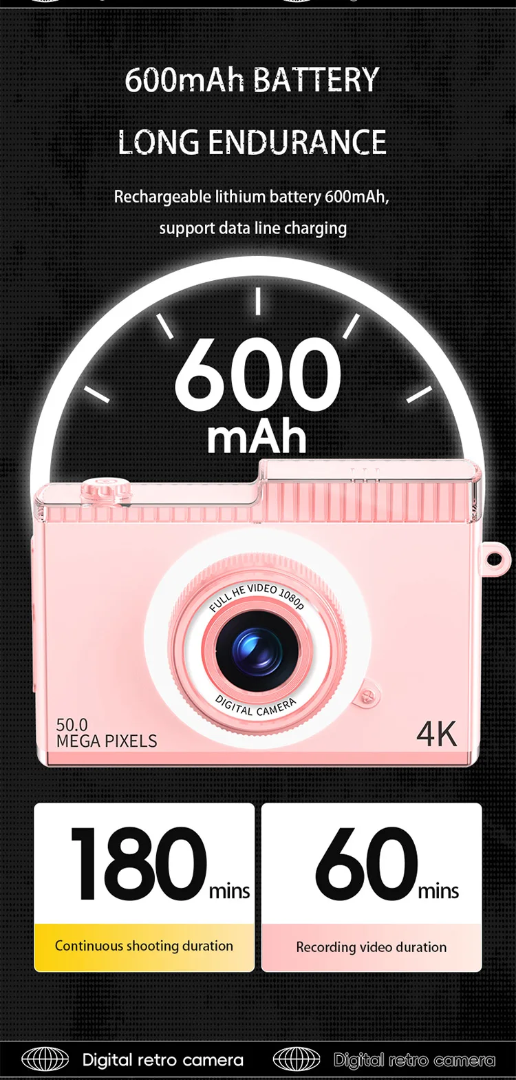 Mini 2.7k hd digitální fotoaparát, barva růžová, 8xzoom, baterie 700mah , jednoduše použitelný...