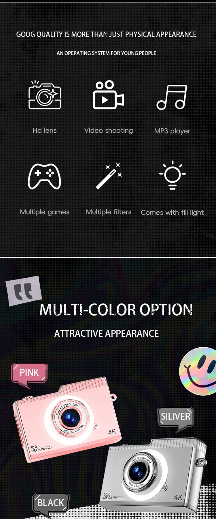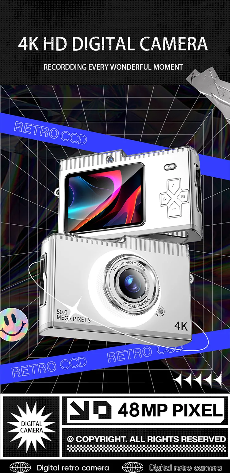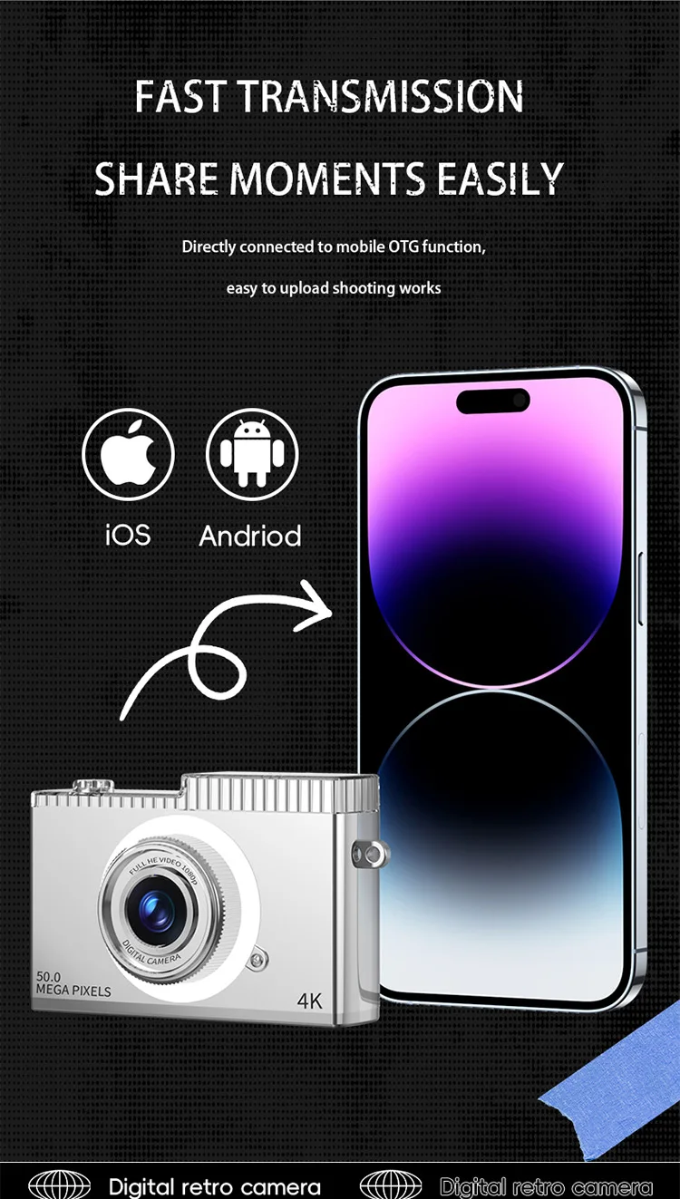 Digitální fotoaparát 50Mp, přední a zadní fotoaparát, obrazovka 2,4 palců. Video z rozlišením 4K HD pro děti od 6 let a začátečníky. Tento model je v černé barvě.