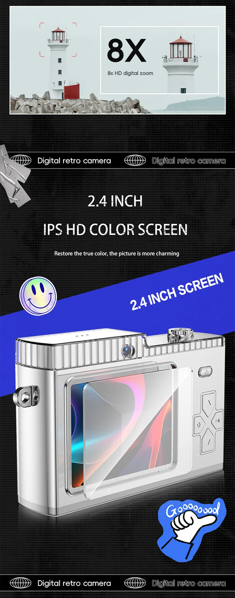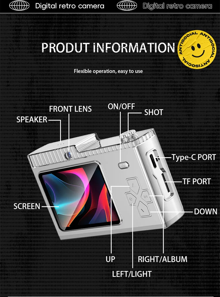 Vestavěná LED svítilna, duální čočky, funkce nahrávání, fotografie jedním kliknutím, pixely s vysokým rozlišením, HRY, Nightshot, fotoaparát s výměnnými objektivy, MP3, filtr, podpora WIFI