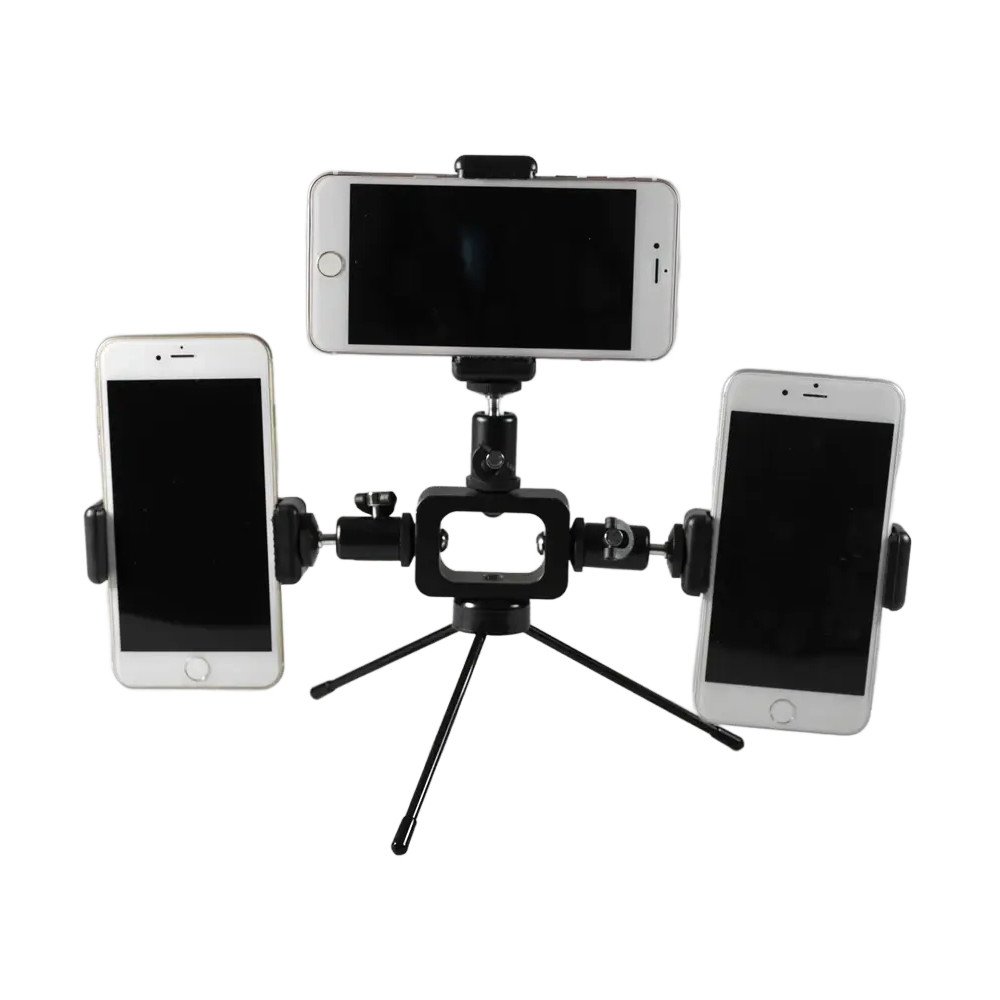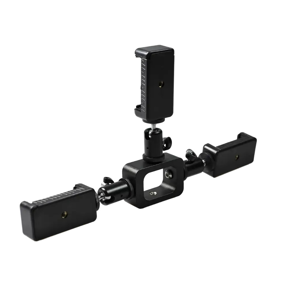 Trojitý držák využijete při natáčení, při streamingu, cheatování s více lidmi. Klipy pevně drží vložený telefon, telefon jednoduše vložíte roztažením klipu (jsou univerzální pro většinu telefonů). Každé zařízení je možné nastavit do Vámi požadované polohy pomocí mini kulové hlavy.