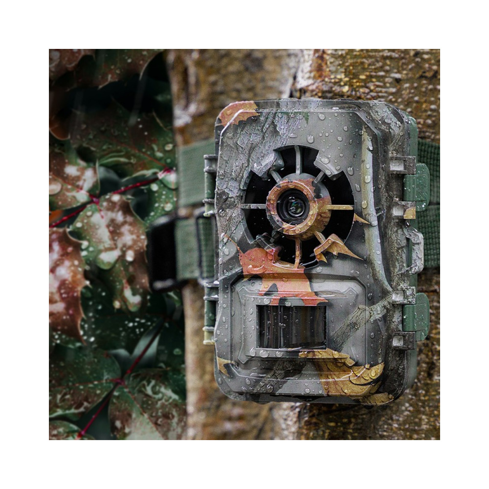 Kryt kamery ji účinně chrání před prachem a vlhkostí. Stupeň krytí IP66 umožňuje provoz v obtížném terénu a povětrnostních podmínkách. Samotné pouzdro je vyrobeno ze silného, odolného plastu. V jeho spodní části se nachází montážní otvor 1/4'' a zásuvka pro připojení síťového adaptéru 6 V / 1,5 A (není součástí balení). Profilované otvory na zadní straně umožňují montáž kamery na kmeny stromů nebo větve pomocí širokého nylonového popruhu, který je součástí sady. V závislosti na použitém zdroji energie může kamera zůstat v pohotovostním režimu až šest měsíců.