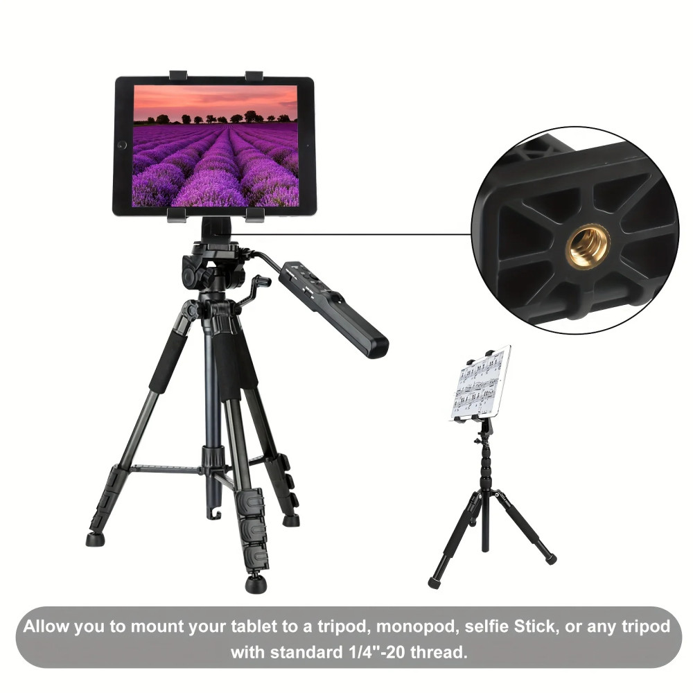 Univerzální montáž: Díky standardnímu 1/4" šroubení je držák snadno připevnitelný na jakýkoli stativ nebo selfie tyč. To umožňuje širokou škálu použití, ať už chcete svůj tablet použít jako náhledový displej při fotografování, nebo si jednoduše užít hands-free sledování videí.