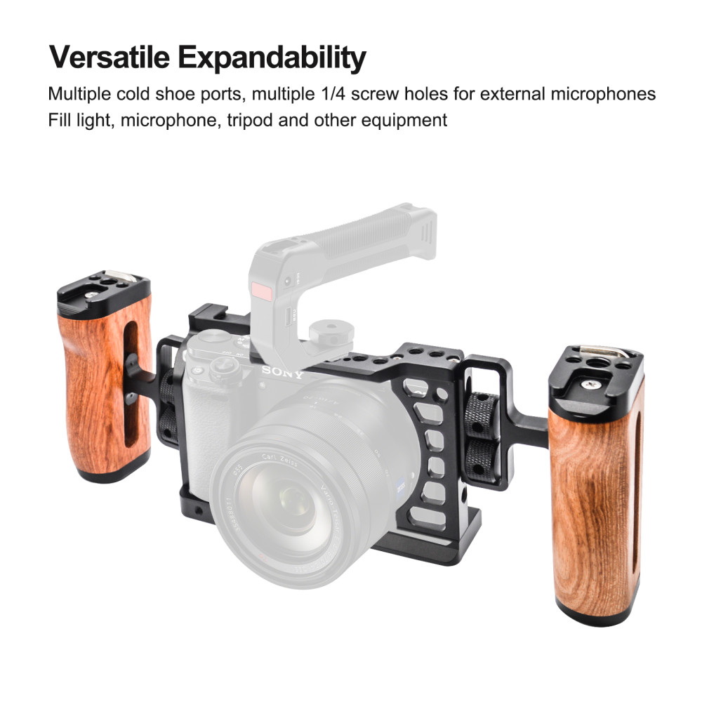 Odolná konstrukce. Multifunkční montážní body pro příslušenství. Tento model je určen pro fotoaparáty Sony A6000 / 6300 / 6500. Je vyroben z vysoce kvalitní hliníkové slitiny, která zajišťuje robustní a dlouhotrvající ochranu vašeho fotoaparátu.