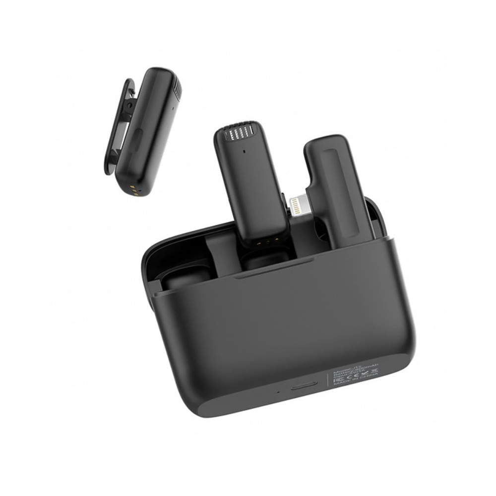 Sada se skládá ze dvou vysílačů vybavených všesměrovými mikrofony a montážními svorkami a přijímače. Díky svým kompaktním rozměrům lze vysílače snadno připnout do límce košile nebo halenky a použít je jako tradiční klopové mikrofony. Na mikrofonech jsou přepínače pro párování zařízení. Přiložený přijímač se zapojuje přímo do Lightning portu na vašem smartphonu nebo tabletu. Rádiová komunikace zajišťuje stabilní připojení a funkce aktivního potlačení hluku má pozitivní vliv na kvalitu zvuku. Zařízení jsou uložena ve vyztuženém pouzdře, které zároveň funguje jako nabíjecí stanice.
