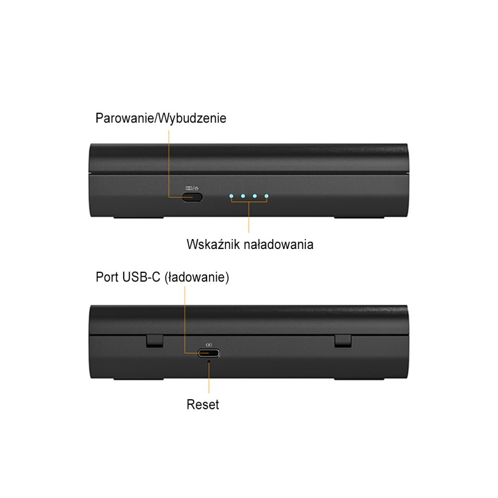 Přijímač disponuje třemi konektory: 3,5 mm konektorem pro sluchátka (TRS/TRRS) pro odposlech zvuku a dvěma porty pro připojení setu k vybranému záznamovému zařízení - 3,5 mm TRS mini jack a USB Type-C. Je vybaven dvěma funkčními klávesami - párovacím tlačítkem a vypínačem, který lze použít i pro změnu mono a stereo režimu. Na přední straně přijímače jsou LED diody indikující stav nabití baterie a aktuální provozní režim. Díky profilovanému klipu můžeme přijímač připevnit k oděvu nebo připevnit k noze fotoaparátu.