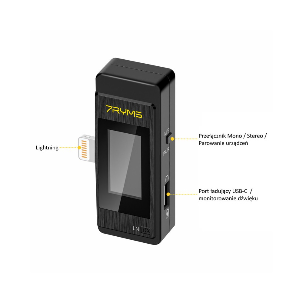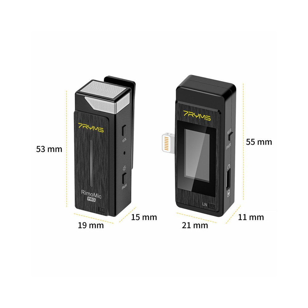 7Ryms RimoMic Pro je sada mikroportů určená pro zařízení Apple iOS, jako je iPhone nebo iPad, která se skládá ze dvou bezdrátových mikrofonů a přijímače s konektorem Lightning. Mikrofony jsou kompaktní, snadno použitelné a pohodlné. Vysílače mají klipy pro připevnění na halenku nebo bundu a vestavěné baterie s kapacitou 95 mAh. Přijímač je zapojen do záznamového zařízení a čerpá energii přímo z něj. Mikrofony spolu komunikují rádiem na frekvencích 2,4 GHz na vzdálenost až 50 m (bez terénních překážek).