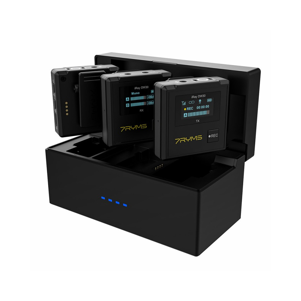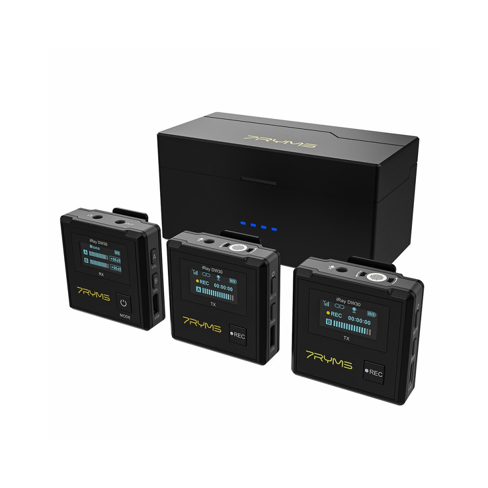 Duální bezdrátový mikrofon 7Ryms iRay DW30 je miniaturní sada mikroportů pro dva uživatele. Souprava se skládá z přijímače a dvou vysílačů, které spolu komunikují rádiem. Vyměnitelné 3,5 mm kabely TRS a TRRS mini jack umožňují připojení k fotoaparátům, videokamerám, záznamníkům zvuku, smartphonům a tabletům. Součástí balení je pouzdro na powerbanku.