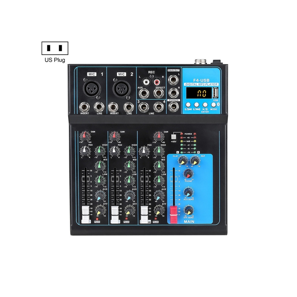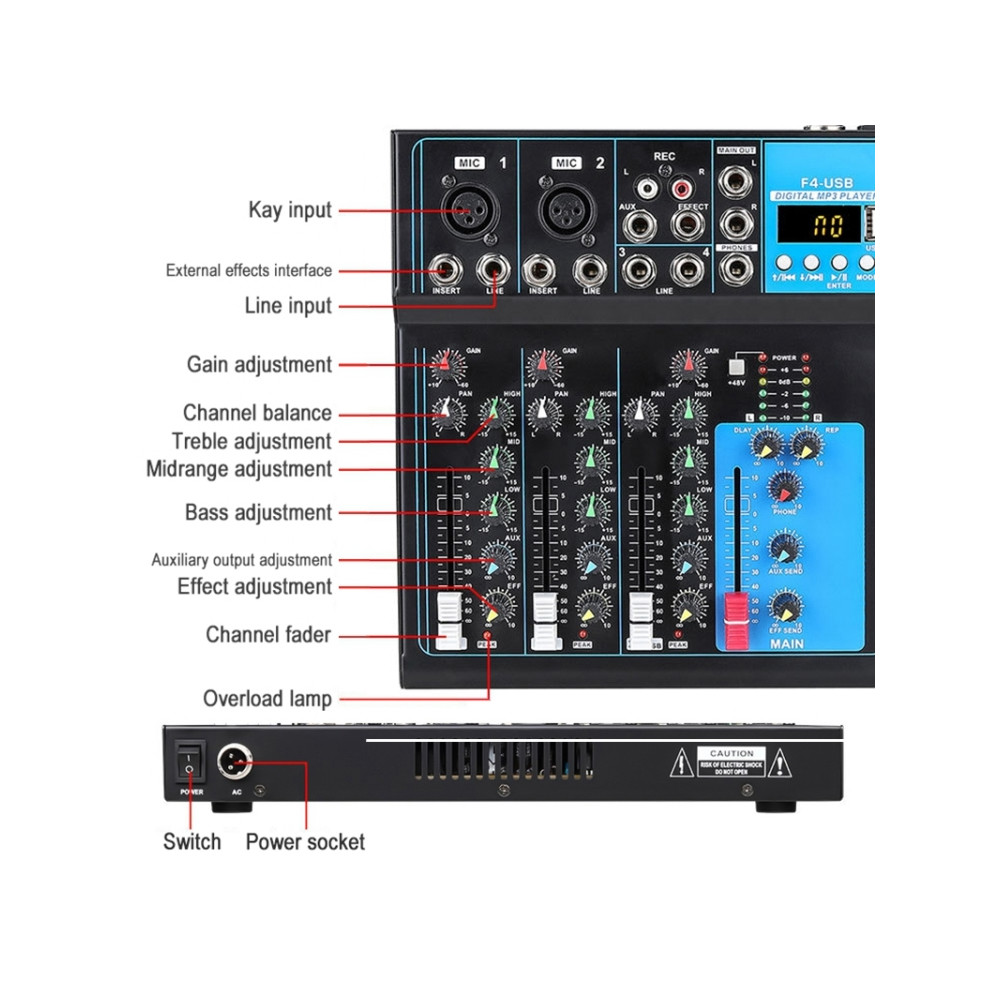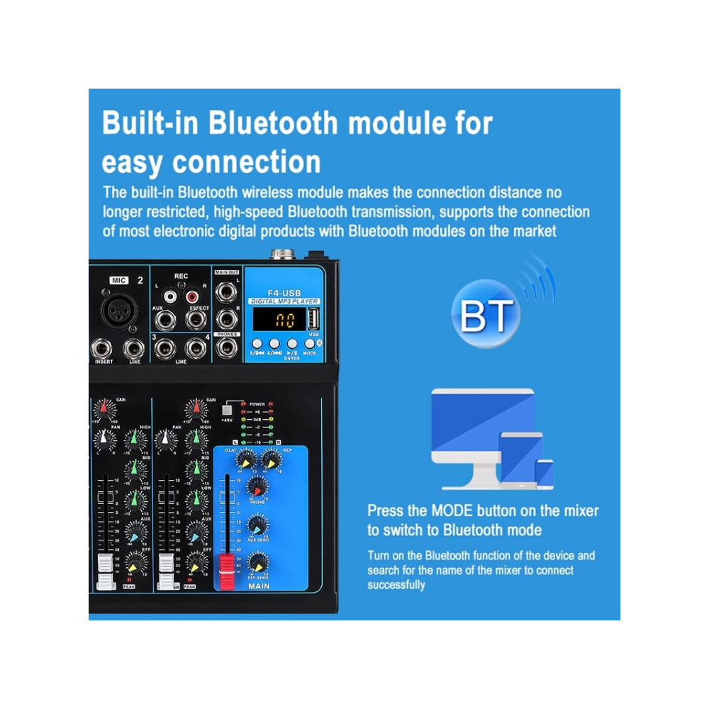 Mixážní pult F4 je perfektní volbou pro ty, kteří hledají spolehlivý a výkonný nástroj pro řízení zvuku s moderními technologiemi, jako je Bluetooth a USB přehrávání. Jeho robustní konstrukce a široká škála funkcí z něj činí ideálního partnera pro každou hudební příležitost.