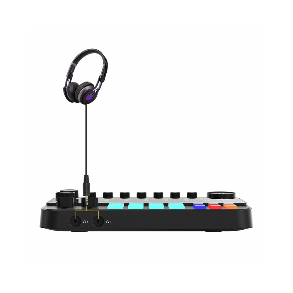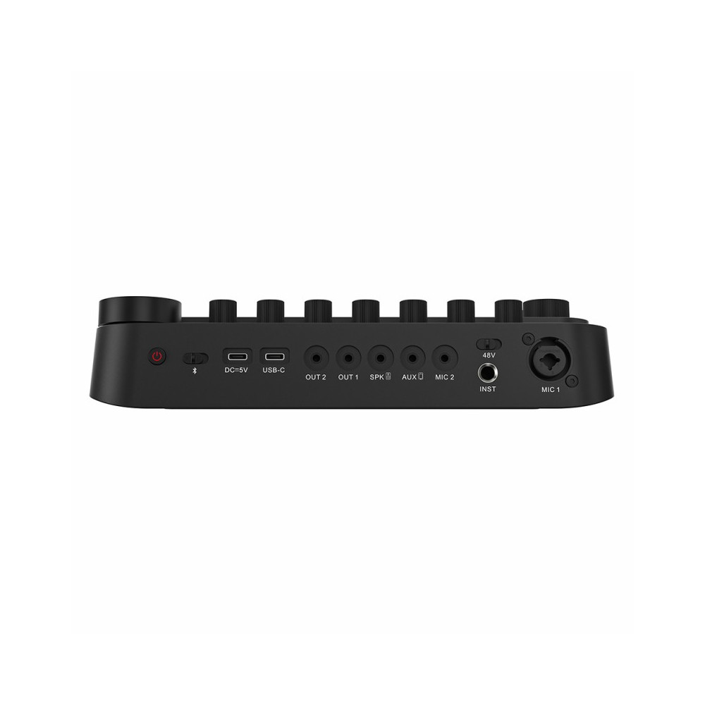 - USB-C – digitální obousměrný port: vstup a výstup. Může přijímat zvuk z telefonu (např. hudbu na pozadí) nebo posílat zpět již smíchaný zvuk, což zatraktivní naše příběhy nebo živé reportáže na sociálních sítích. Pokud chcete použít možnost přenosu do zařízení, musíte na konzoli povolit funkci Loop Back.