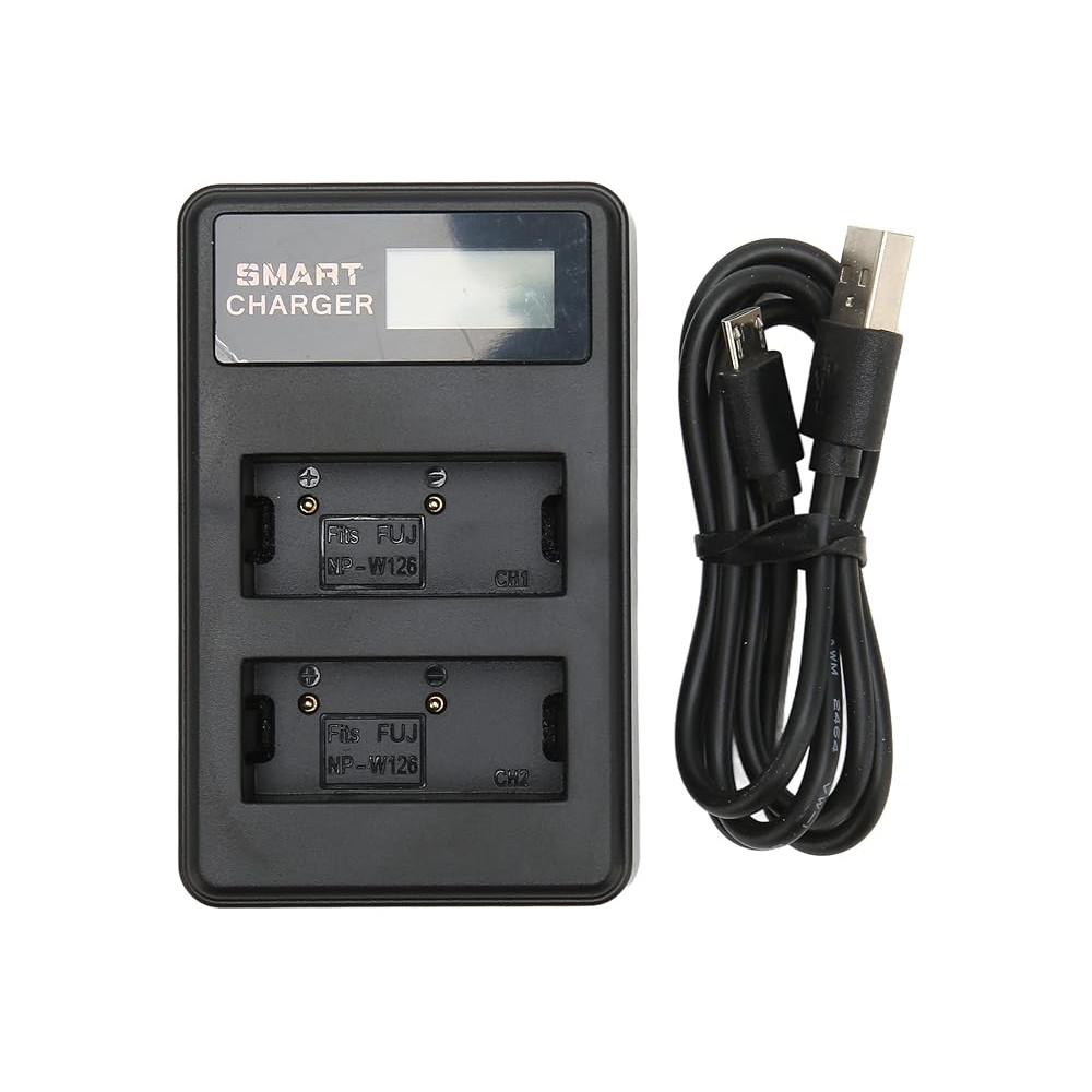 Přenosná USB nabíječka. Displej s indikací nabití baterií. Vhodná pro 2 ks baterie NP-W126 pro fotoaparáty