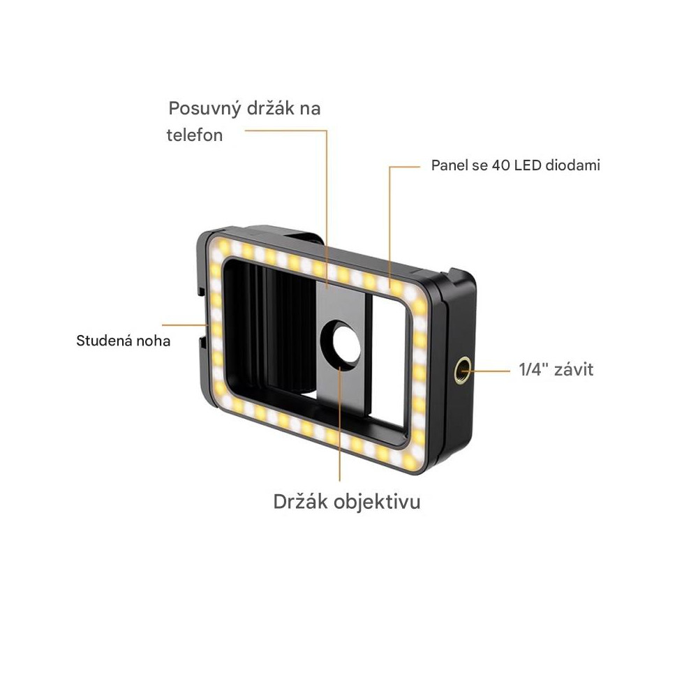 Montážní držák je vybaven nastavitelnou svorkou s rozsahem 50–90 mm, což umožňuje snadné připevnění na většinu smartphonů. Pro další možnosti je držák vybaven 1/4" závitem pro montáž na stativ a ISO nožkou pro připojení externích doplňků. Vestavěná baterie o kapacitě 350 mAh poskytuje až 2 hodiny provozu na maximální výkon, což je ideální pro dlouhé fotografické seance. Nabíjení je snadné a rychlé díky univerzálnímu USB-C portu.