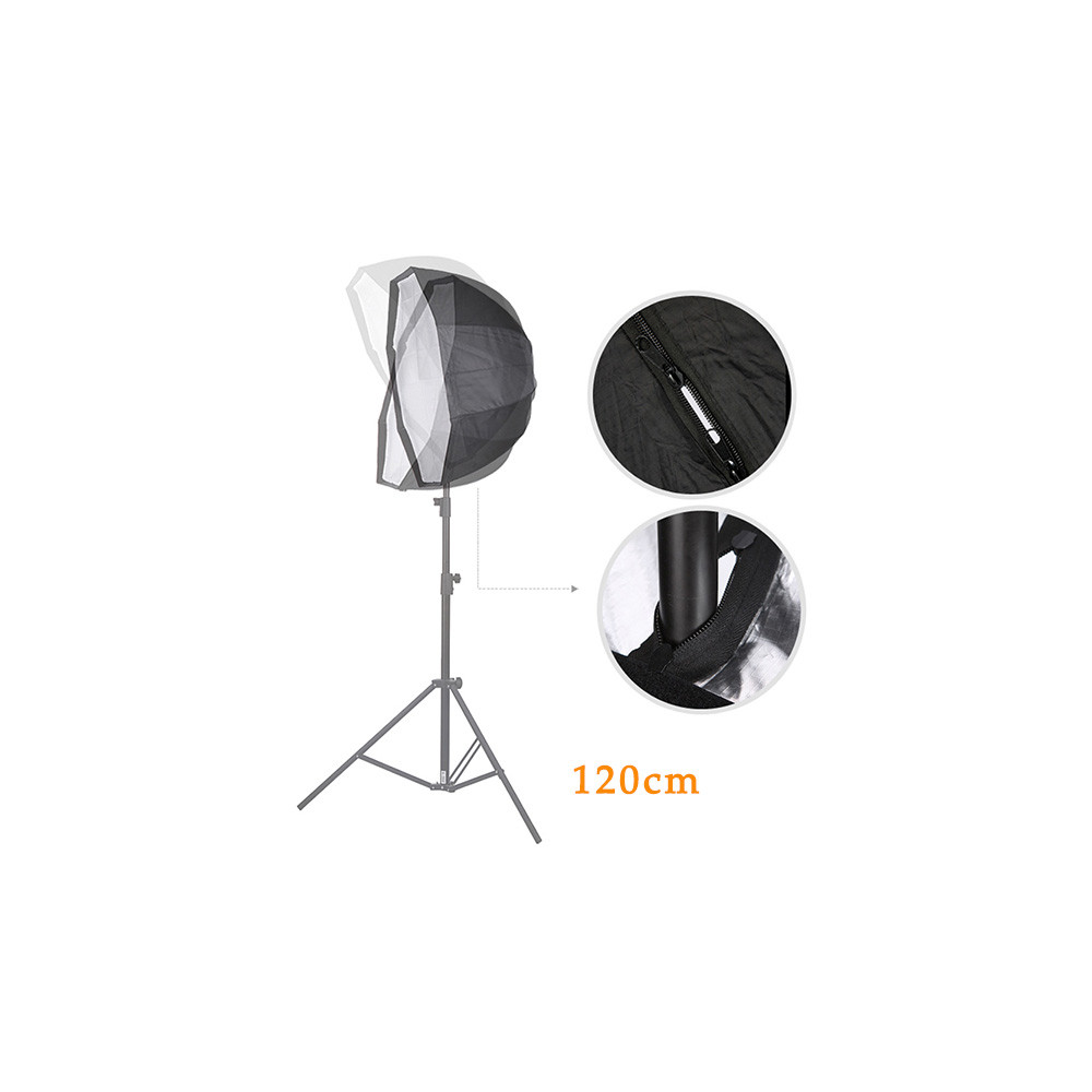 Kompaktní a přenosný: Navzdory svému velkému průměru je softbox lehký a snadno přenosný, což umožňuje jeho snadné použití v terénu nebo v různých studiových podmínkách.