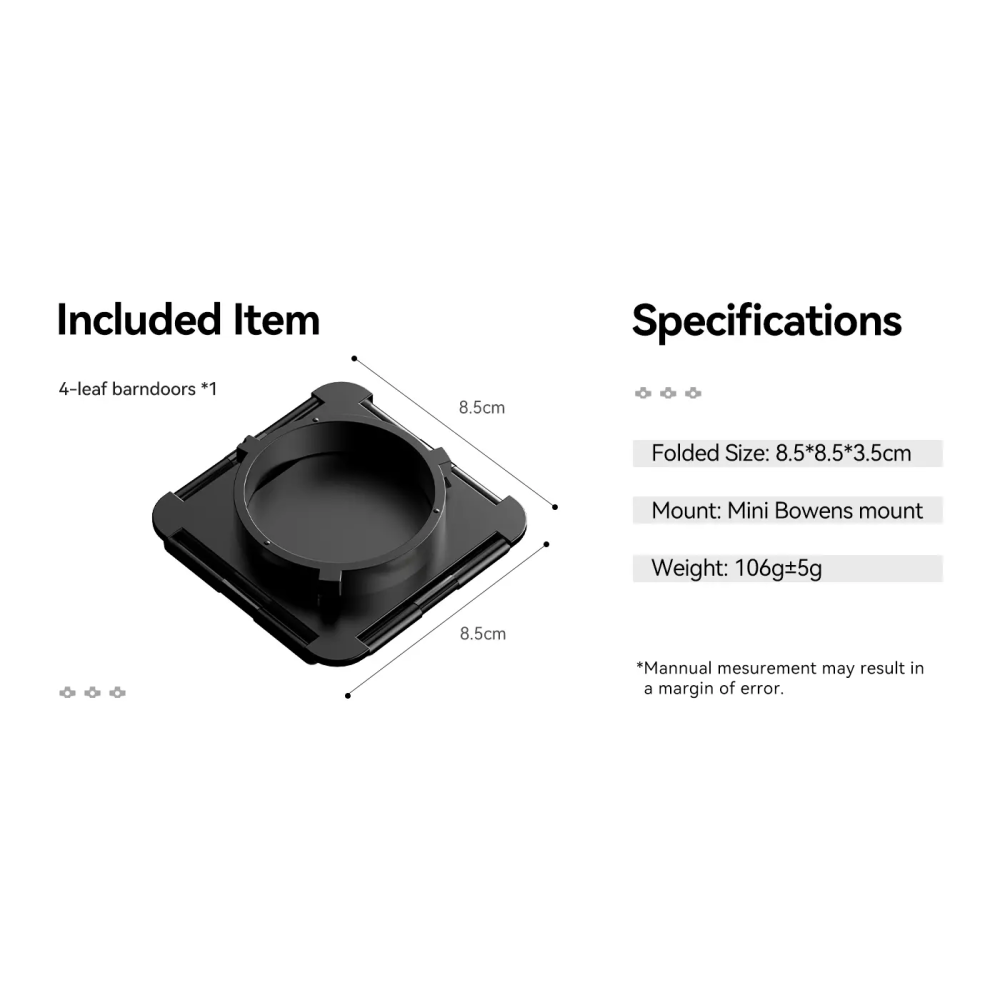 Ulanzi Mini Barndoors jsou ideálním řešením pro všechny, kdo chtějí mít plnou kontrolu nad směrem a šířkou světelného paprsku. Tento produkt je speciálně navržen pro použití s Ulanzi světly s Mini Bowens držákem, jako jsou modely L028 40W, L023 a L005 60W a jiné s Mini Bowens uchycením.