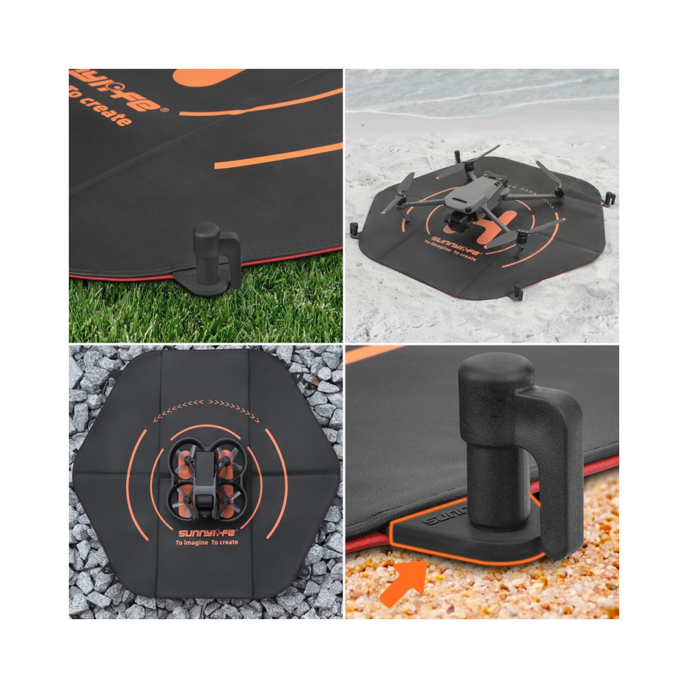 Sunnylife TJP09-60 je šestihranná podložka - přistávací plocha o průměru 60 cm, vyrobená z vyztuženého, nepromokavého materiálu. Navrženo pro práci s většinou modelů dronů v různých terénních podmínkách. Složený naplocho je uložen v praktickém přepravním kufříku. Sada obsahuje čtyři kolíky, které umožňují připevnění k zemi.