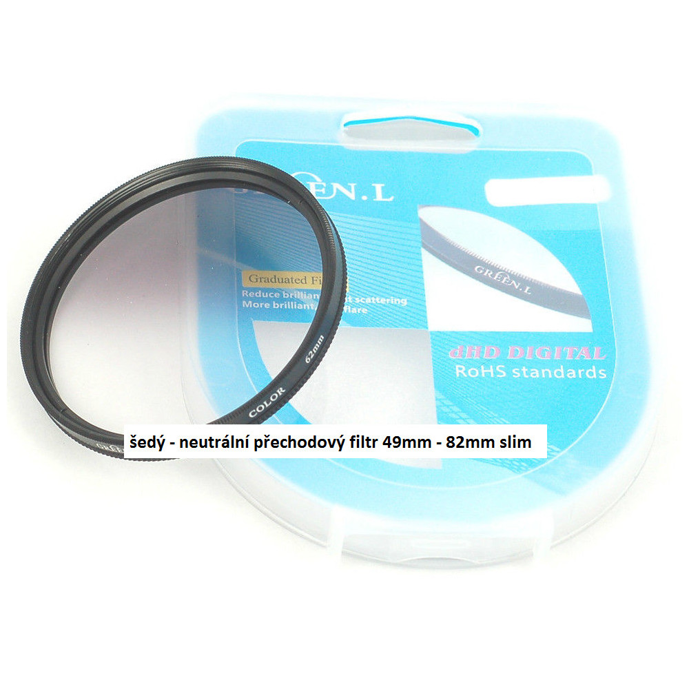 přechodový filtr šedý Green-L D-HD 55mm. Tento barevně neutrální filtr snižuje propustnost světla o 50%. Je vhodný, pokud chceme snížit v jedné polovině fotografované scény expozici o jedno clonové číslo. Vhodné např. pro prokreslení a zvýraznění mraků, oblohy atd...