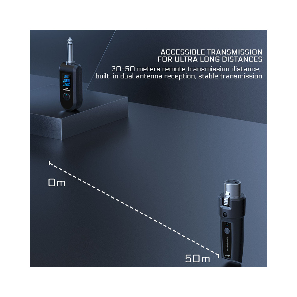 Dosah a výdrž: S přenosovou vzdáleností až 50 metrů poskytuje systém dostatečnou volnost pohybu na jevišti. Napájení zajišťuje dobíjecí lithiová baterie s kapacitou 3,7 V a 1000 mAh, která nabízí 8-12 hodin pracovní doby na jedno nabití. To je ideální pro dlouhá vystoupení a natáčení bez nutnosti častého dobíjení.
