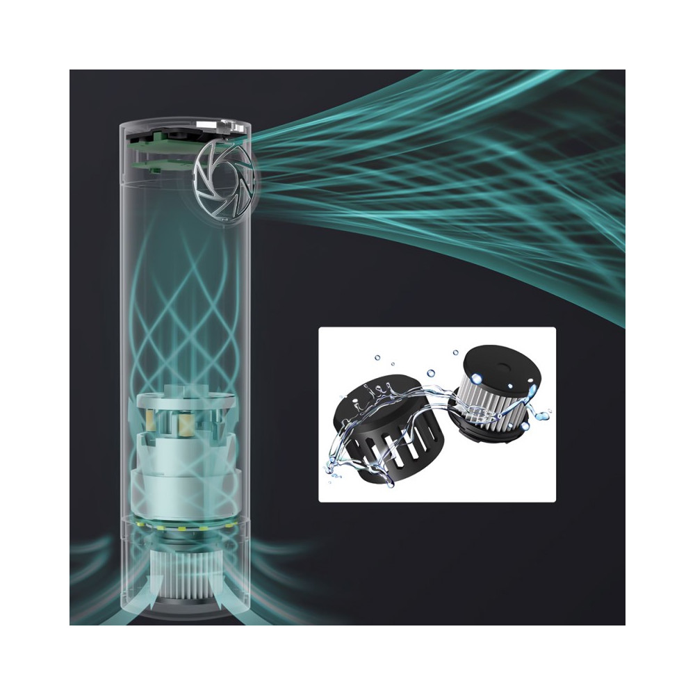 Vestavěný HEPA filtr a dvojitý ventilační systém zabraňují opětovnému usazování nečistot. Stříkačka má baterii s kapacitou 10 000 mAh, která poskytuje výdrž od 23 minut provozu v nejvýkonnějším režimu až po 90 minut v nejnižším režimu. Rychlé nabíjení USB-C PD 3.1 vám umožní nabít baterii až na 90 % za pouhou jednu hodinu. Možnost používat ventilátor během nabíjení eliminuje problém s vybitím energie v klíčových okamžicích.