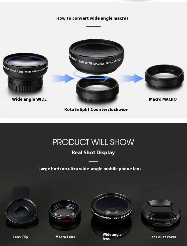 198 stupňů Rybí oko + 0,63 x širokoúhlí objektiv + 15xMakro + 2x Portrétní zrcadlo +...