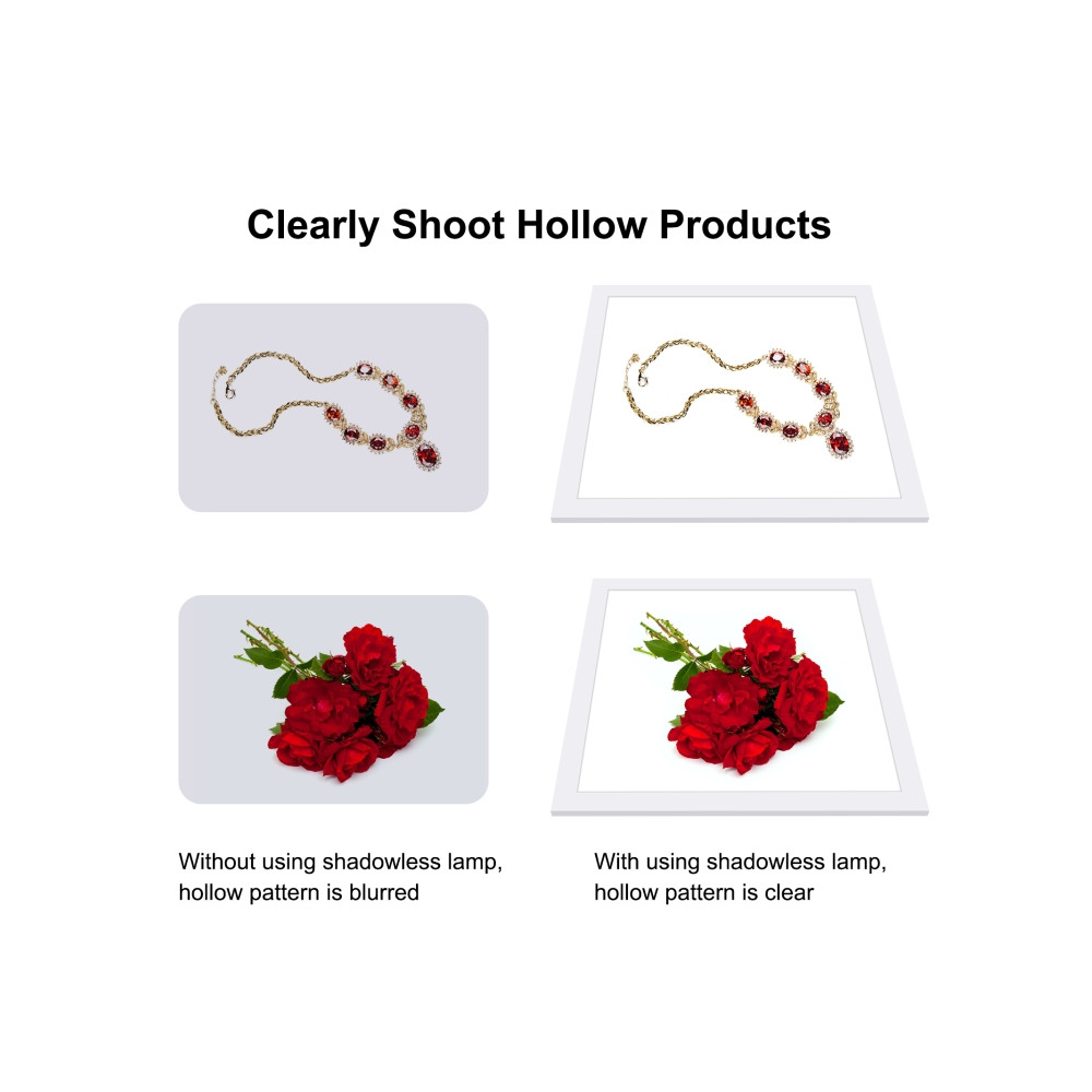 Bezstínové světlo je perfektní pro komerční fotografování široké škály předmětů, jako jsou šperky, kosmetika, modely v měřítku, umělecká díla, skleněné výrobky, elektronické přístroje a módní doplňky. Jeho ultra-tenký design zajišťuje rovnoměrné a super jasné osvětlení bez blikání, což přispívá k profesionálnímu vzhledu vašich fotografií.