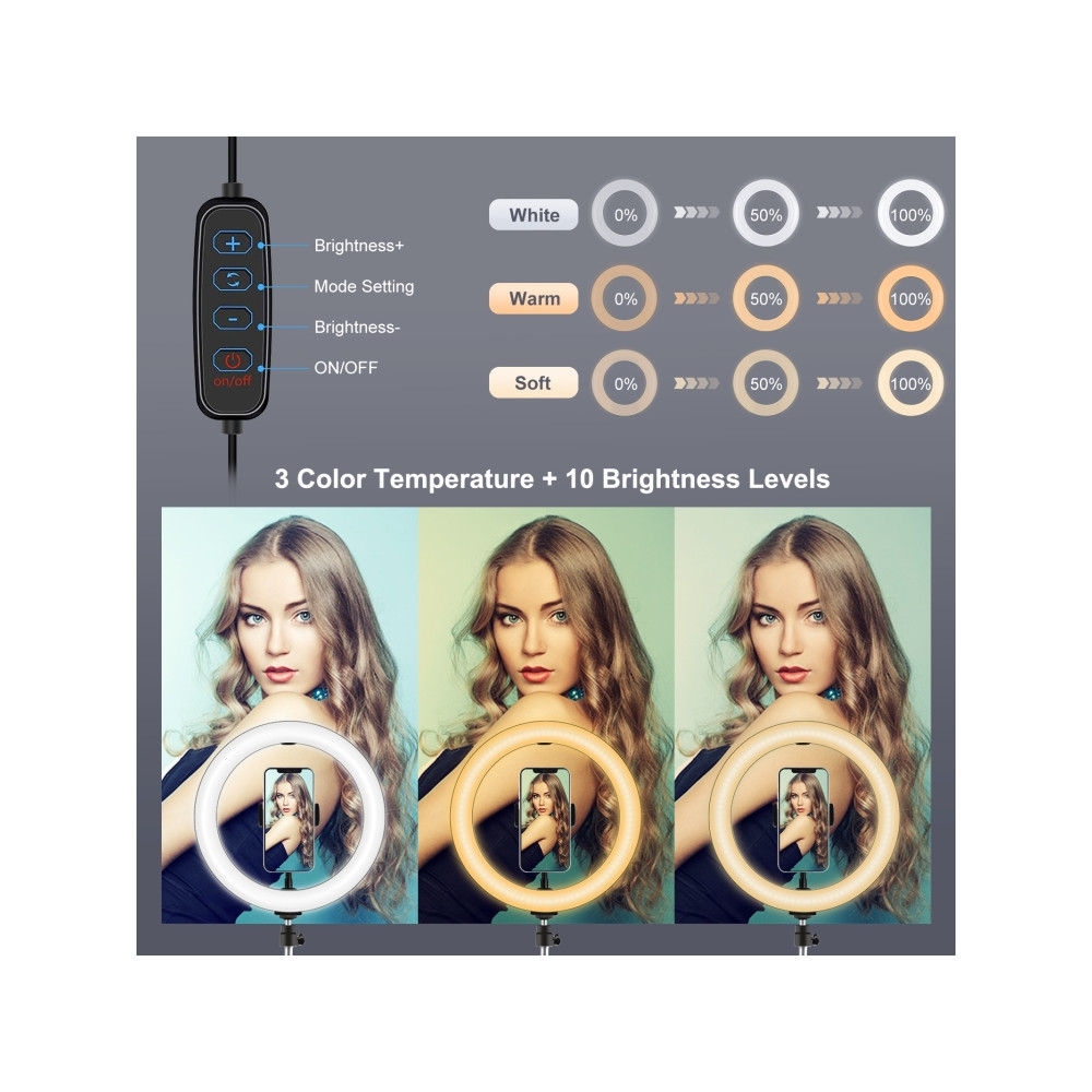 Toto kruhové světlo je vybaveno 2x48 úspornými LED kuličkami, které zajišťují vynikající odvod tepla a konstantní proudový pohon. Díky vysokému barevnému podání CRI >90 dokáže zjemnit zdroj světla a zvýraznit tón pleti při portrétní fotografii. Užijte si tři různé režimy osvětlení – bílé světlo s teplotou 6500K, teplé bílé světlo s teplotou 3200K a přirozené světlo, které osvětluje vaši krásu při různých příležitostech. S nastavitelným jasem v rozmezí 1 % až 100 % můžete snadno přizpůsobit osvětlení vašim potřebám bez nutnosti instalace dalších barevných filtrů.