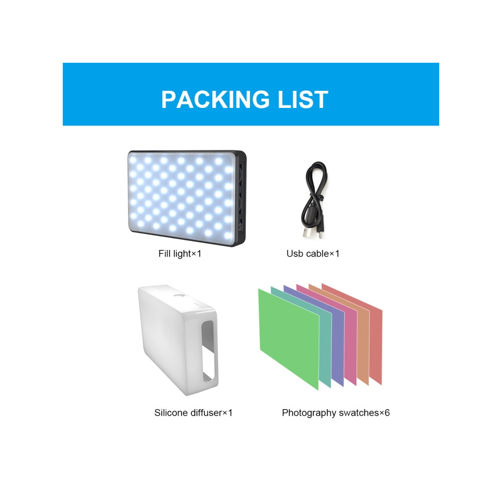 1. LED výplňové osvětlení: K dispozici je 120 výkonných LED světelných korálků s 6 nastavitelnými barevnými filtry a 20 druhy světelných efektů. LED video světlo se vyznačuje úhlem osvětlení až 120 stupňů.