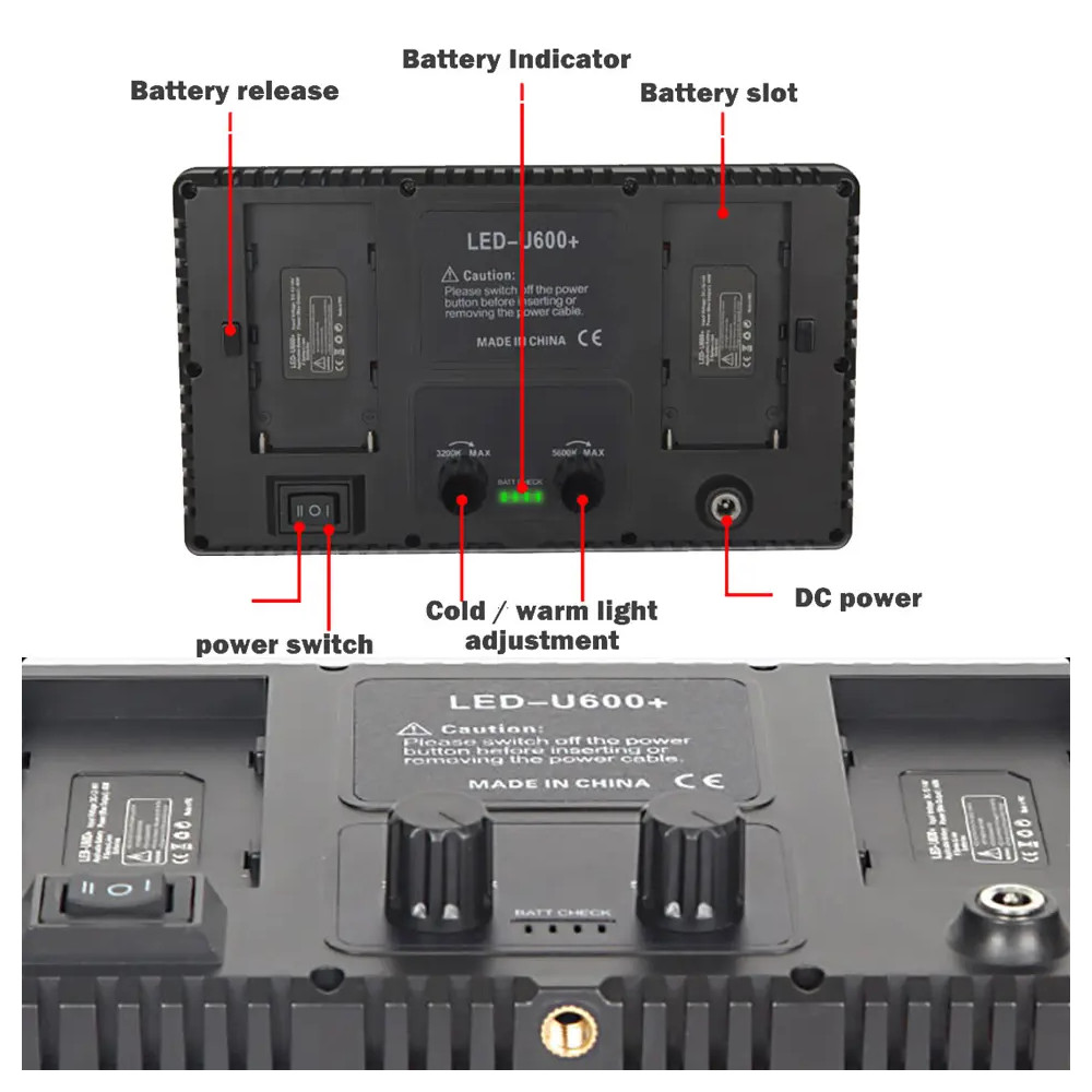 LED panel U600 s výkonem 40W je možné osadit 2 ks bateriemi tipu NP-F550, NP-F750 ( nejsou součástí balení ). Na zadním panelu je indikace stavu nabití baterií, vypínač a dva regulátory kde se nastavuje intenzita a teplota barev světla. Stativ , který je součástí balení je dostatečně pevný a stabilní k danému světlu. Jeho výška je nastavitelná v rozmezí od 100 do 205 cm. Světlo se uchycuje pomocí šroubení 1/4" , je možné ho použít na fotoaparát a jiné zařízení.