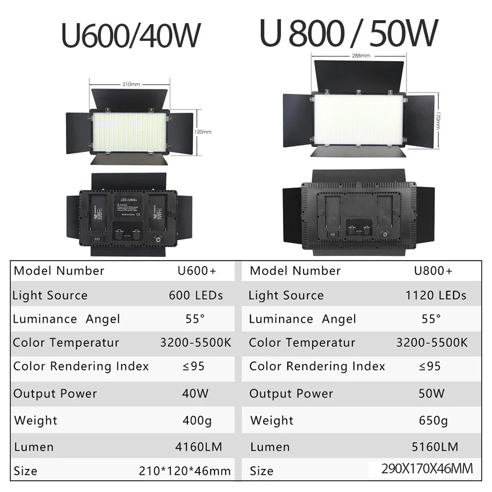 LED panel U600 s výkonem 40W nabízí nastavitelnou intenzitu i teplotu barev v rozmezí 3200K-5600K. Součástí jsou klapky pro kontrolu světla, stativ 100-210 cm, adaptér pro napájení ze sítě 220V.
