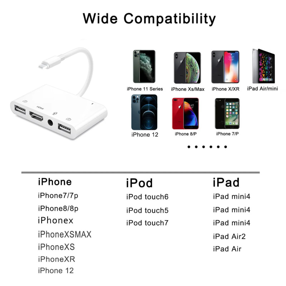 Adaptér je kompatibilní s řadou zařízení, včetně iPhone 12, 12 Pro, 11, 11 Pro, iPhone XR, XS, XS Max, iPhone 8, 7, 6, iPad Air, mini, iPad Pro a iPod touch (5. generace). Je to cenově dostupný způsob, jak rozšířit možnosti vašeho zařízení bez nutnosti investice do chytré televize.