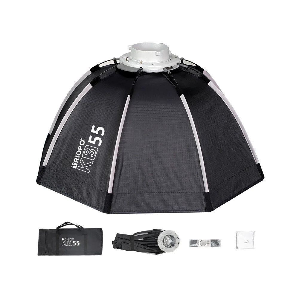 Softbox je určený hlavně pro záblesková světla. Systém Bowens Mount na který je možné namontovat většinu zábleskových i stálých světel. Průměr tohoto softboxu je 55 cm, hloubka 31 cm. Součástí balení je i voština ( grid ), difuzní plátno, přenosné pouzdro.
