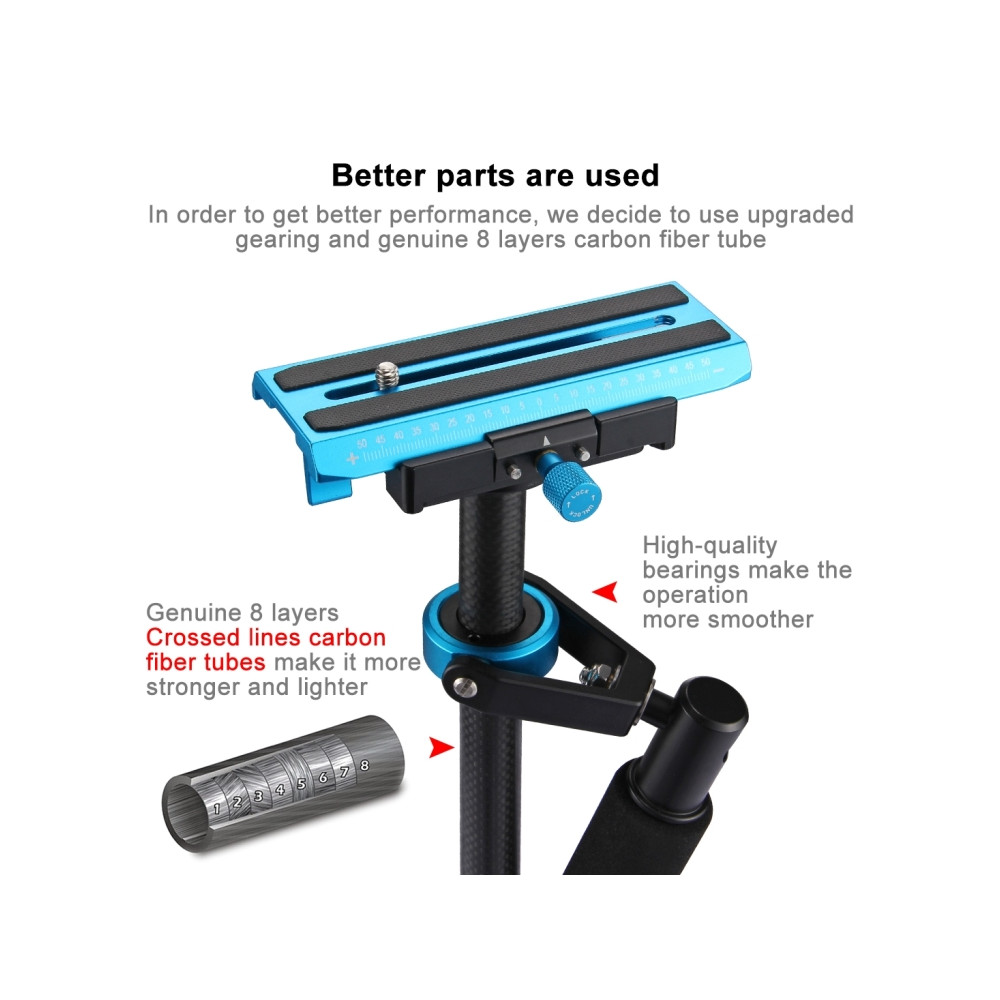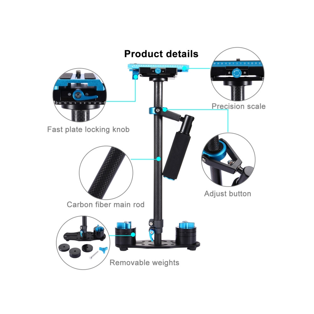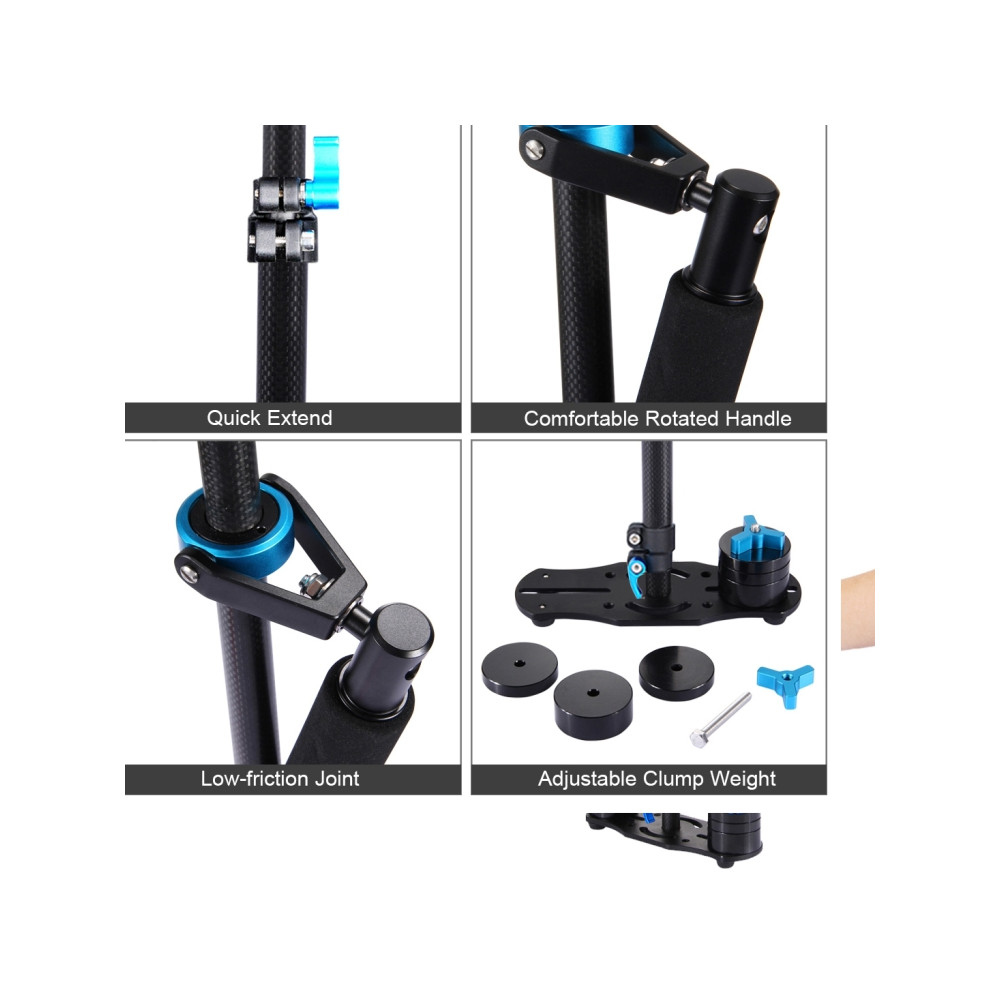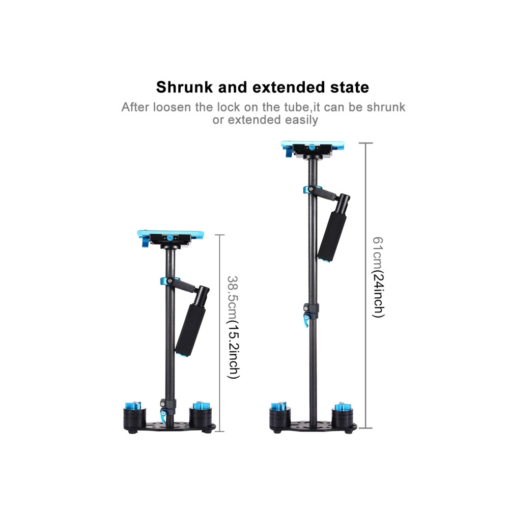 Tento PULUZ 38,5–61 cm karbonový ruční stabilizátor (model S60T / P60T) je mechanický stabilizační systém typu "steadycam" určený pro plynulé natáčení videa bez otřesů. Díky konstrukci z uhlíkových vláken nabízí vysokou pevnost při zachování nízké hmotnosti samotného zařízení.