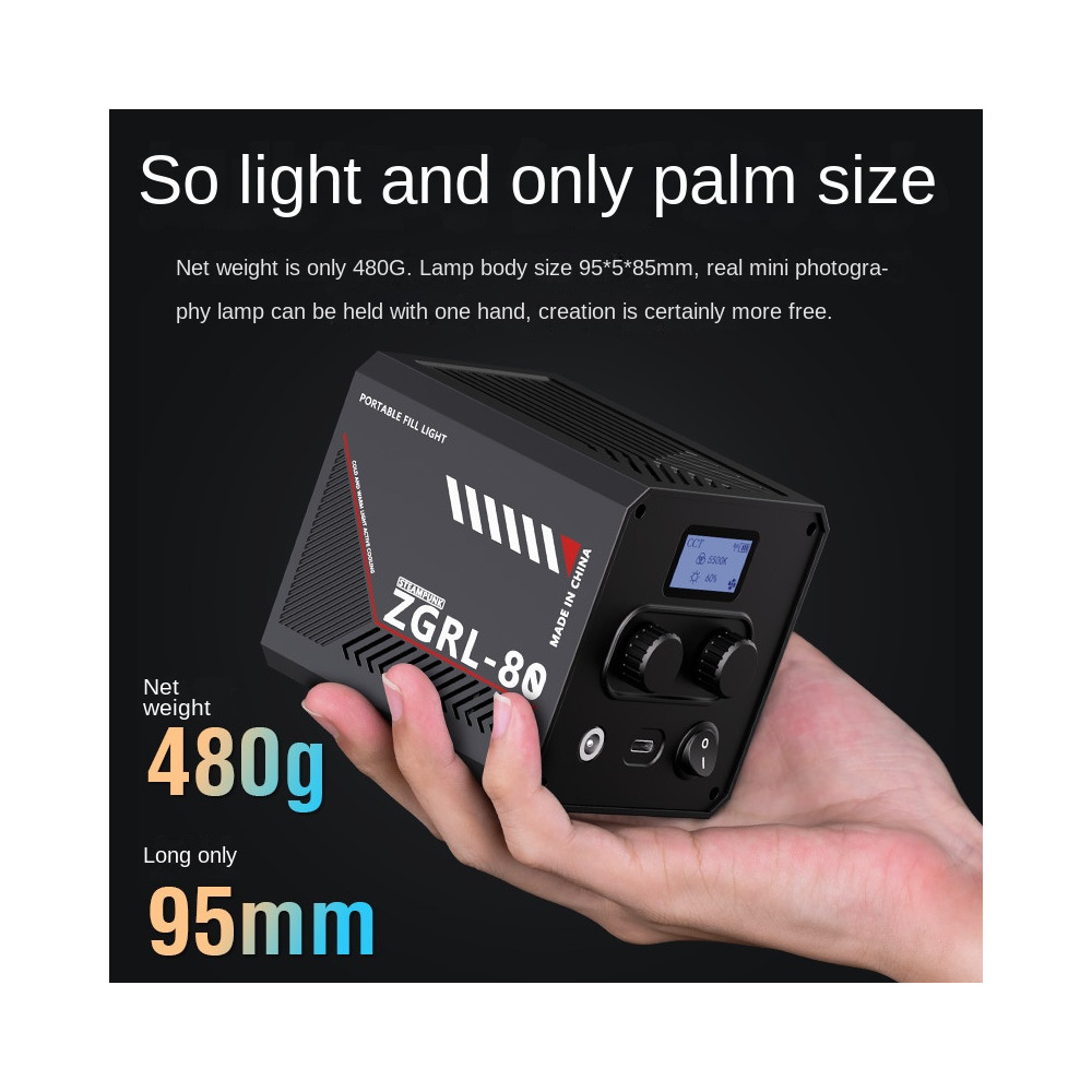 Přenosné LED Bi-Color fotografické studiové světlo 80 W. Nastavitelná teplota barev 2800-6500K. Upevnění na stativ a podobně pomocí 1/4" šroubení. Vestavěná baterie 2500mAh s výdrží při max. intenzitě 70 minut nebo při nízké úrovni až 20 hodin.Napájení (nabíjení) pomocí přiloženého adaptéru a nebo pomocí USB-C nabíječky (není součástí). Doba nabíjení cca 3 h. Součástí je také rukojeť, kterou je po rozložení možné použít jako ministativ.
