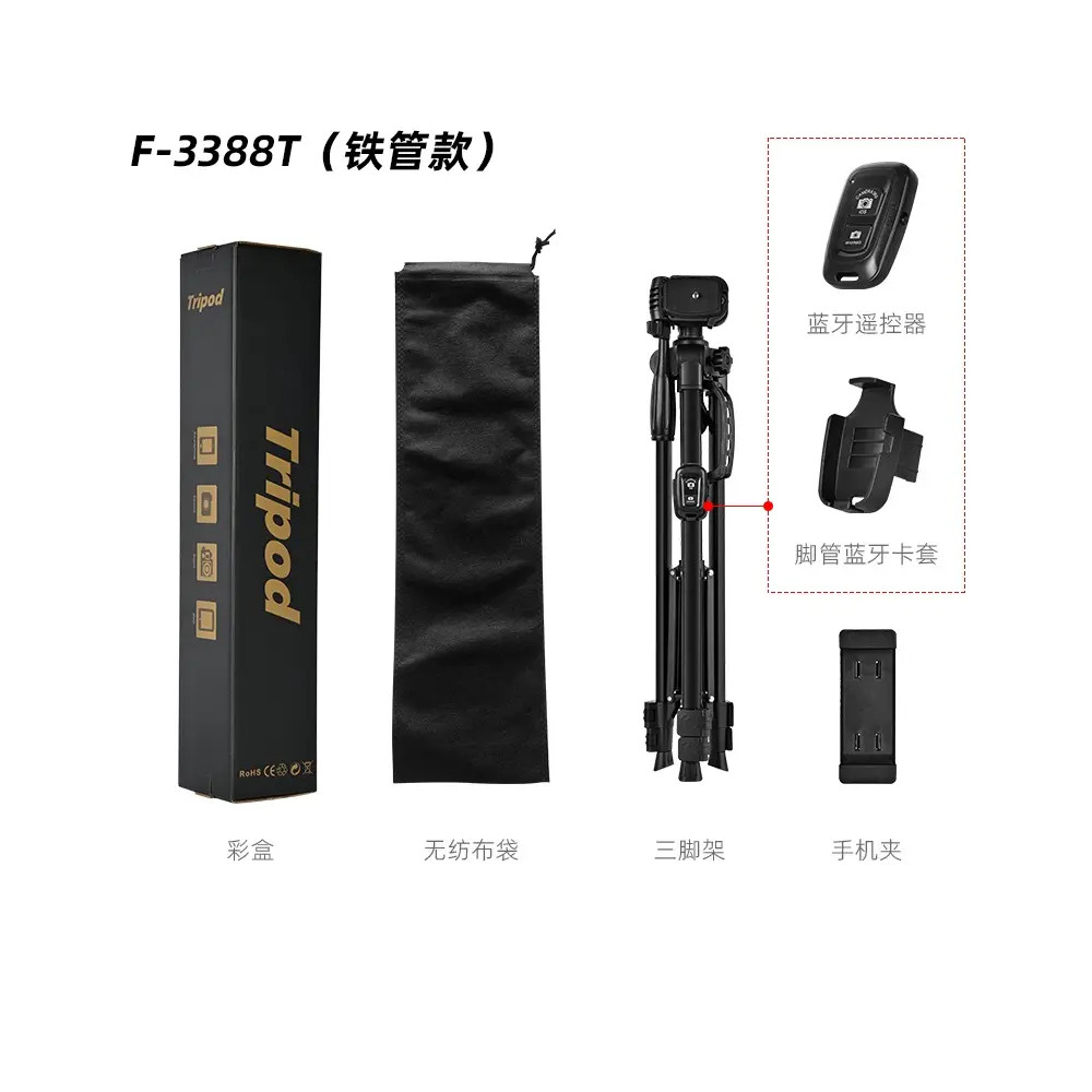 Stativ F-3388T je všestranný a robustní stativ určený pro smartphony, fotoaparáty a další záznamová zařízení. Díky nastavitelné výšce a otáčení o 360° nabízí stabilní podporu pro fotografování, natáčení videa, živé vysílání a další. Je vyroben z lehkých, ale odolných materiálů, snadno se přenáší a má protiskluzové gumové nožičky pro větší stabilitu. Součástí balení je bezdrátová spoušť s dosahem 10m a držák pro telefon. Fotoaparát lze připevnit pomocí 1/4" závitu.