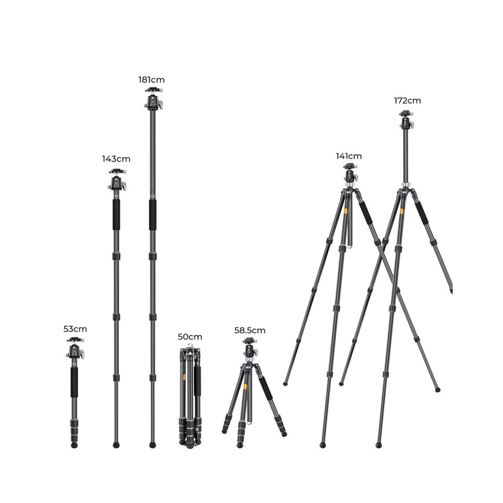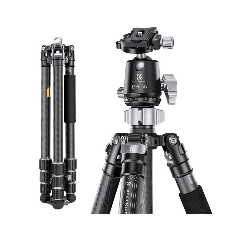 K&F Concept Karbonový fotografický stativ s funkcí monopodu X284C4 s kulovou hlavou 172cm (KF09.117) je ideálním společníkem pro všechny fotografy a kameramany, kteří hledají všestrannost, stabilitu a kompaktní design v jednom balení. Tento pokročilý 2v1 nástroj je vyroben z kvalitních materiálů, jako jsou uhlíková vlákna a hliník, což zajišťuje jeho lehkost a odolnost. Váží pouhých 1,76 kg, což usnadňuje jeho přenositelnost, zatímco jeho maximální výška dosahuje až 172 cm s nosností 8 kg, což umožňuje použití i s těžšími fotoaparáty a objektivy.