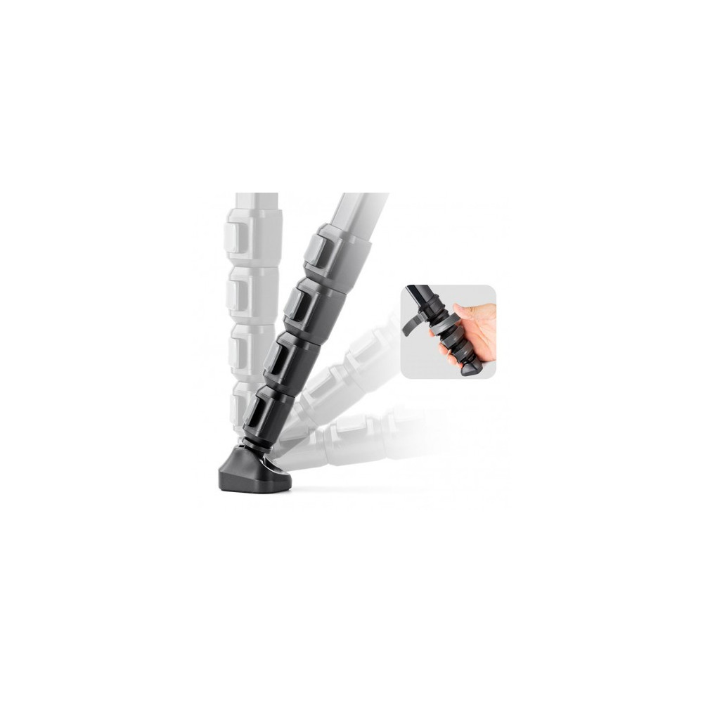 Stativ je vybaven pěti sekčními nohami, které jsou zajištěny západkami pro snadné a rychlé nastavení. Každá noha je zakončena pohyblivou nohou z plastu a kalené gumy, což zajišťuje stabilitu na různých površích. Středový sloupek je vybaven zámkovým tlačítkem pro bezpečné nastavení výšky.