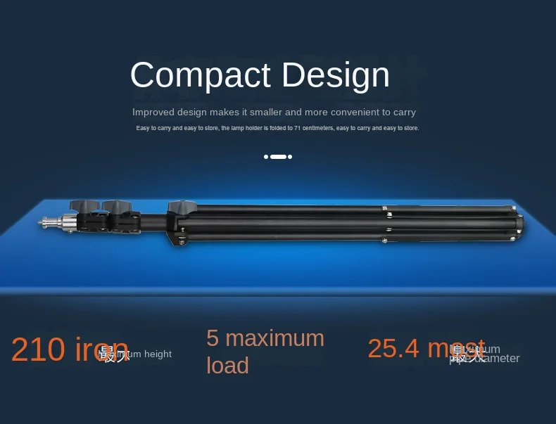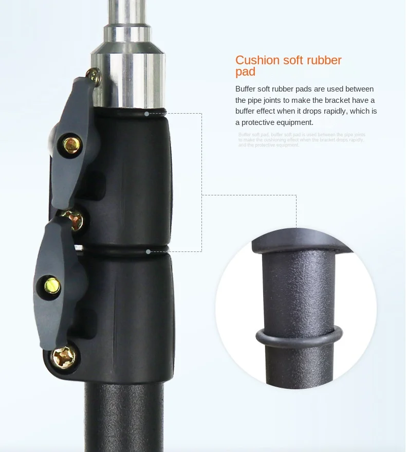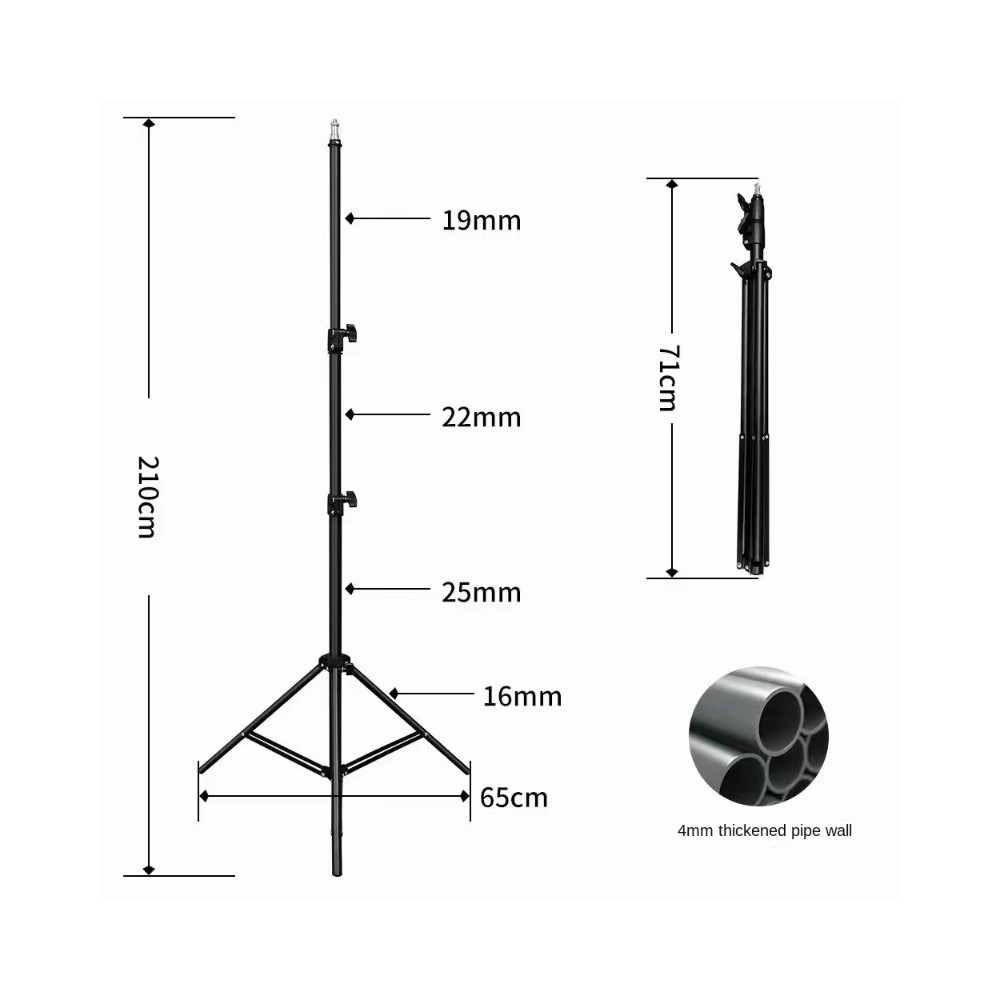 Stativ je vybaven třemi sekcemi nohou, které umožňují snadné nastavení výšky dle potřeby. Díky šroubovacím svorkám je možné nohy pevně zafixovat a zajistit tak maximální stabilitu i na nerovném povrchu. S maximální výškou 2,1 m a pracovní výškou 2 m je stativ dostatečně vysoký pro většinu aplikací, zatímco jeho kompaktní rozměry ve složeném stavu (700 mm) usnadňují přepravu a skladování.