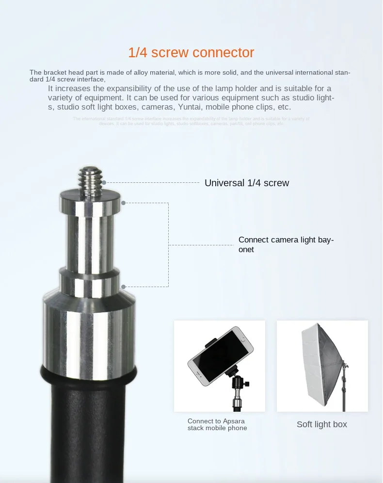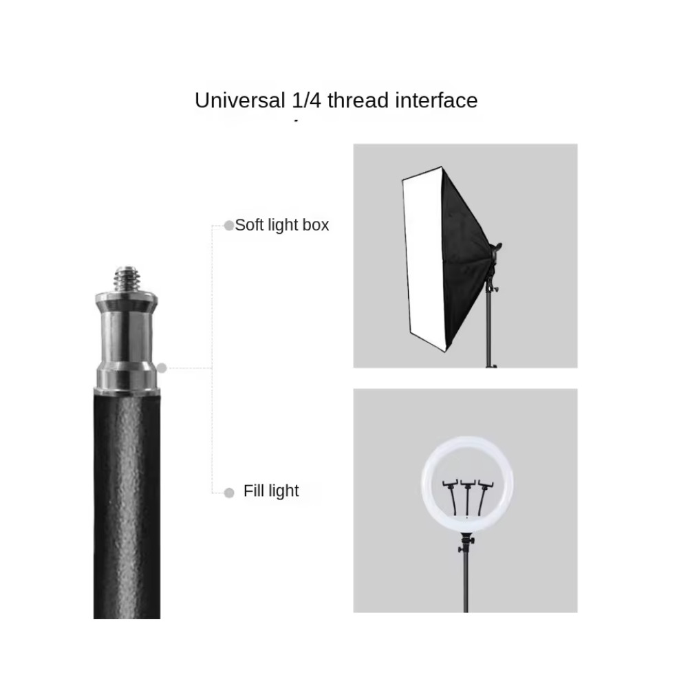 Tento stativ je kompatibilní s širokou škálou zařízení, včetně mobilních telefonů, videokamer a digitálních fotoaparátů, což z něj činí univerzální nástroj pro různé typy natáčení a fotografování. Šroub 1/4" umožňuje rychlé a snadné připevnění příslušenství, jako jsou světla a softboxy, což rozšiřuje možnosti použití stativu v různých situacích.