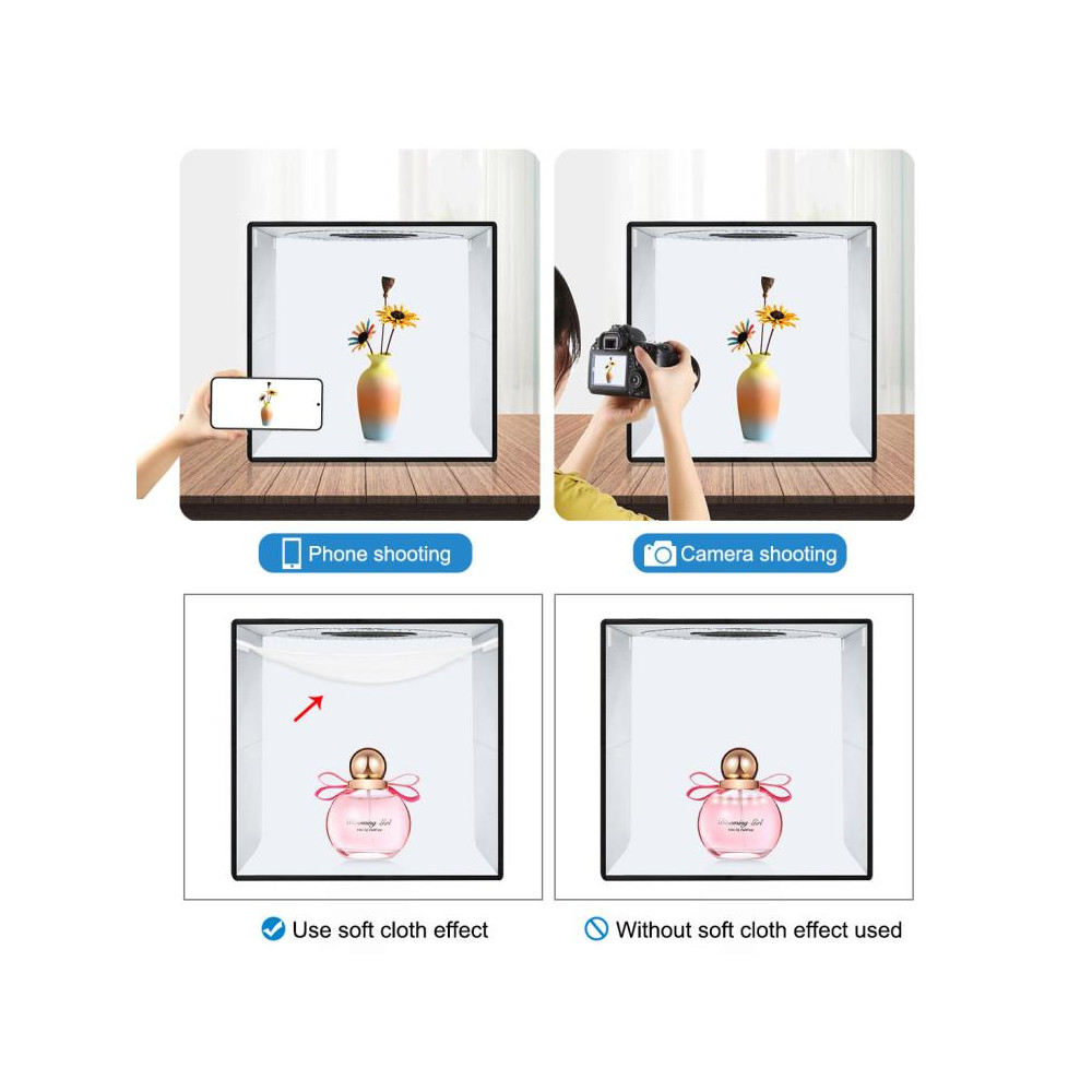 4. Víceúhlové fotografování: Světelný stan umožňuje flexibilní úhel snímání, můžete si vybrat libovolný úhel pro fotografování (přední celé okno, horní okno).