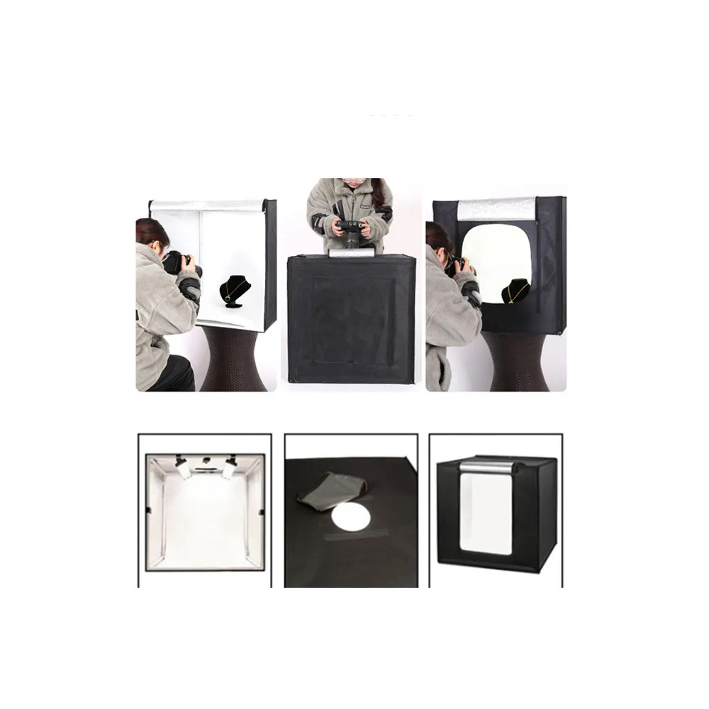 4. Přenosný skládací design, snadnější instalace a přenášení, vestavěné LED světlo, zabraňuje stínům a odrazům na fotografii. Jednoduché sestavení pomocí suchých zipů