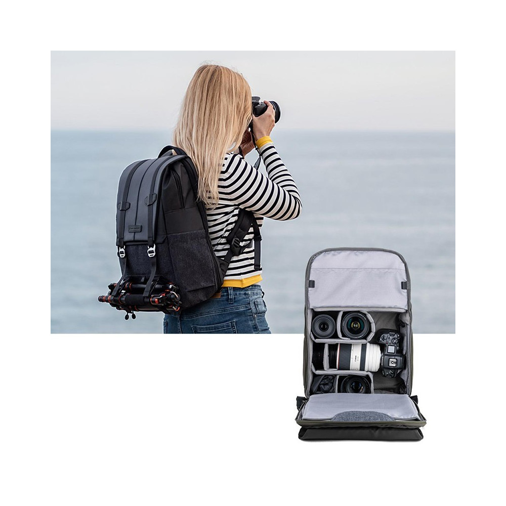 Miejski plecak fotograficzny K&F Concept BETA o pojemności 20 l. Zaprojektowany do bezpiecznego przenoszenia sprzętu fotograficznego, rzeczy osobistych oraz laptopa o przekątnej ekranu 15,6''. Składa się z dwóch głównych komór oraz dodatkowych kieszonek. W komplecie pokrowiec przeciwdeszczowy.