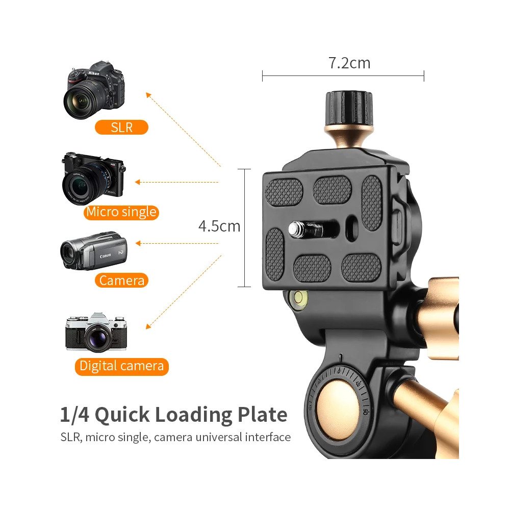 The KWBH-2 is compatible with the Arca-Swiss standard - it can be attached to universal tripods using the 3/8" socket on the bottom. The ball head is made of premium aluminum alloy and is rugged and durable. The 360° panoramic scale on the base makes it easy for the photographer to take panoramic shots and create more beautiful works. Vertical and horizontal bubble levels are ideal for precise alignment. All-metal adjustable damping knob allows for 90° tilt. Aluminum quick release plate with rubberized surface helps the ball head to attach to cameras or camcorders. The included carrying case is useful for storing and transporting the ball head.