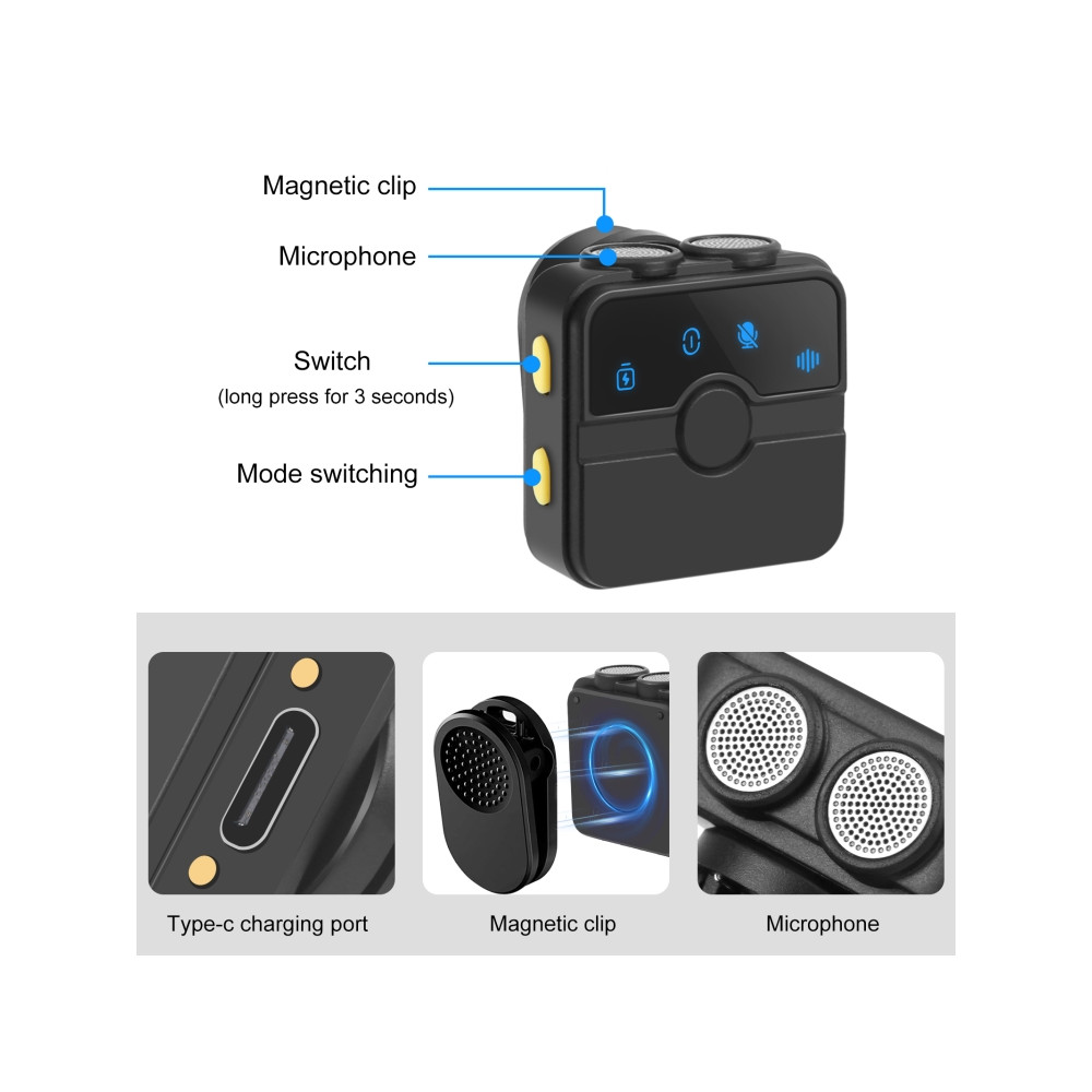 2.4G Wireless Connection:Using a 2.4G wireless connection, the microphone is capable of delivering high-quality recording up to 48K, ensuring clear and detailed sound. This connection is designed to minimize interference and ensure stable signal transmission.
