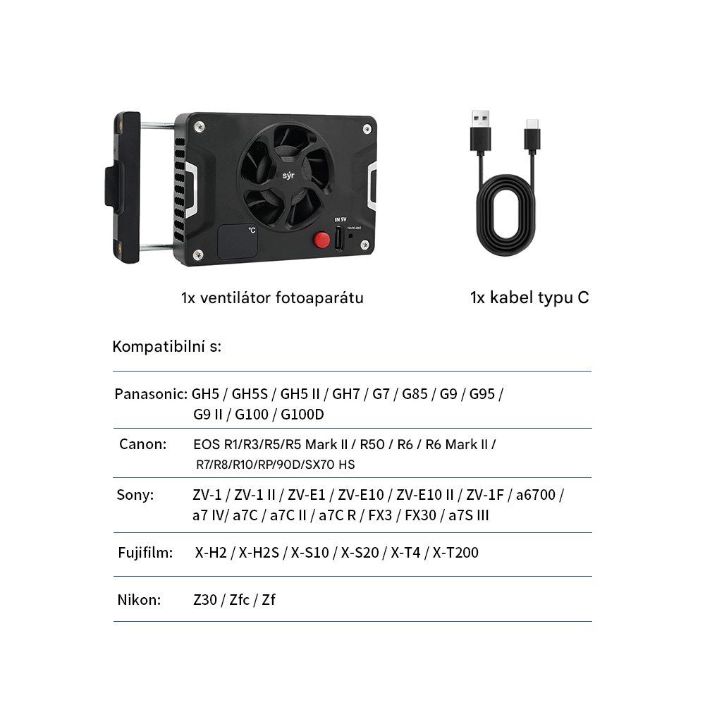 The JN-108 external cooling fan is designed for a wide range of modern mirrorless cameras with flip-up displays. Supported models include: